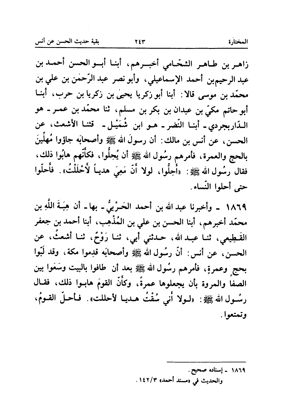 1869 - وَأَخْبَرَنَا عَبْدُ اللَّهِ بْنُ أَحْمَدَ الْحَرْبِيُّ بِهَا أَنَّ هِبَةَ اللَّهِ بْنَ مُحَمَّدٍ أَخْبَرَهُمْ أبنا الْحَسَنُ بْنُ عَلِيِّ بْنِ الْمُذْهِبِ أبنا أَحْمَدُ بْنُ جَعْفَرٍ الْقَطِيعِيُّ ثَنَا عَبْدُ اللَّهِ حَدَّثَنِي أَبِي ثَنَا رَوْحٌ ثَنَا أَشْعَثُ عَنِ الْحَسَنِ عَنْ أَنَسٍ أَنَّ رَسُولَ اللَّهِ صَلَّى اللَّهُ عَلَيْهِ وَسَلَّمَ وَأَصْحَابَهُ قَدِمُوا مَكَّةَ وَقَدْ لَبَّوْا بِحَجٍّ وَعُمْرَةٍ فَأَمَرَهُمْ رَسُولُ اللَّهِ صَلَّى اللَّهُ عَلَيْهِ وَسَلَّمَ بَعْدَ أَنْ طَافُوا بِالْبَيْتِ وَسَعَوْا بَيْنَ الصَّفَا وَالْمَرْوَةِ بِأَنْ يَجْعَلُوهَا عُمْرَةً وَكَأَنَّ الْقَوْمَ هَابُوا ذَلِكَ فَقَالَ رَسُولُ اللَّهِ صَلَّى اللَّهُ عَلَيْهِ وَسَلَّمَ لَوْلا أَنِّي سُقْتُ هَدْيًا لأَحْلَلْتُ فَأَحَلَّ الْقَوْمُ وَتَمَتَّعُوا