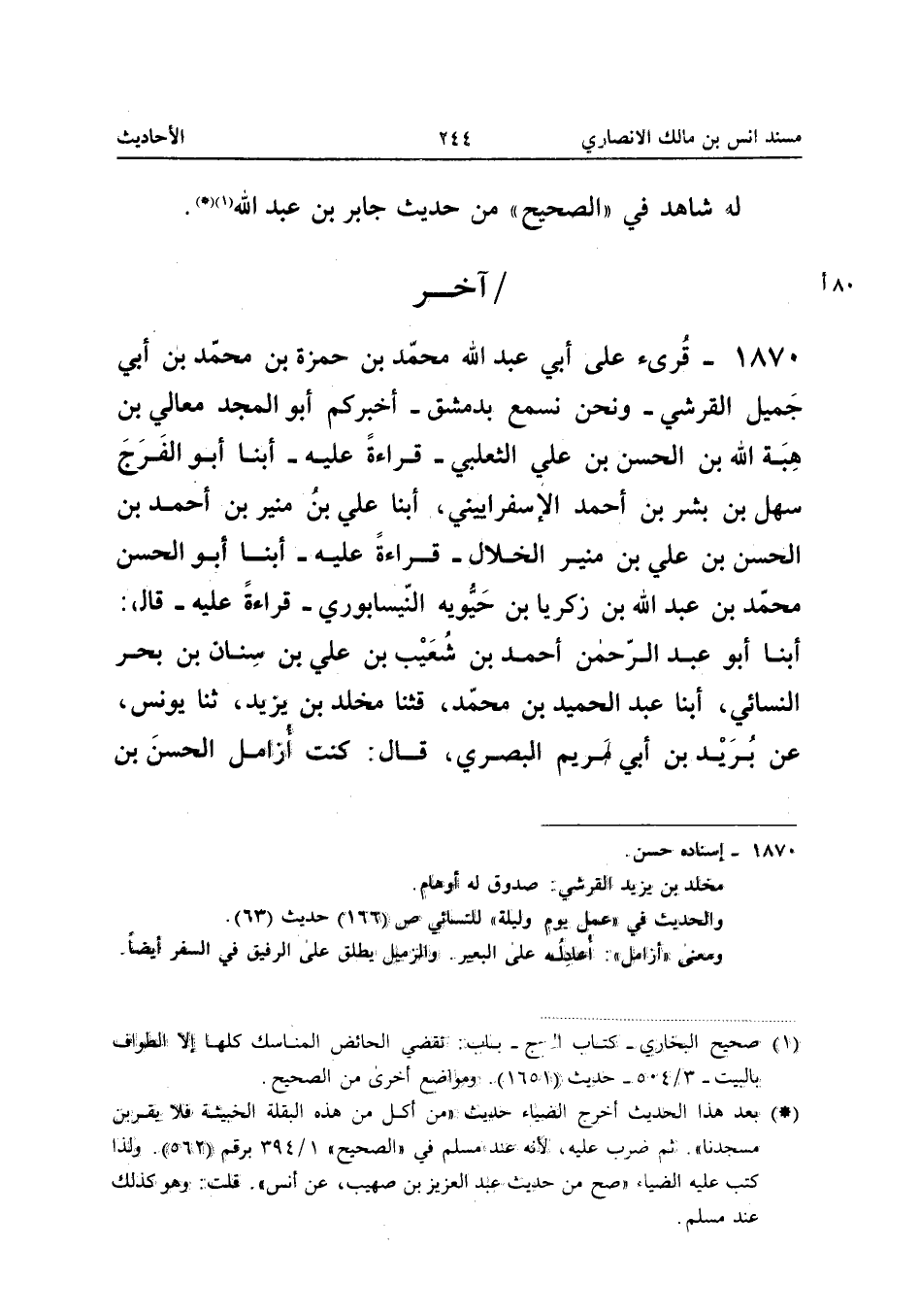 1870 - قُرِئَ عَلَى أَبِي عَبْدِ اللَّهِ مُحَمَّدِ بْنِ حَمْزَةَ بْنِ مُحَمَّدِ بْنِ أَبِي جَمِيلٍ الْقُرَشِيُّ وَنَحْنُ نَسْمَعُ بِدِمَشْقَ أخبركُمْ أَبُو الْمَجْدِ مَعَالِي بْنَ هِبَةِ اللَّهِ بْنِ الْحَسَنِ بْنِ عَلِيٍّ الثَّعْلَبِيّ قِرَاءَة عَلَيْهِ أبنا أَبُو الْفَرَجِ سَهْلُ بْنُ بِشْرِ بْنِ أَحْمَدَ الإِسْفَرَايِينِيُّ أبنا عَلِيُّ بْنُ مُنِيرِ بْنِ أَحْمَدَ بْنِ الْحَسَنِ بْنِ عَلِيِّ بْنِ مُنِيرٍ الْخلال قِرَاءَةً عَلَيْهِ أبنا أَبُو الْحَسَنِ مُحَمَّدُ بْنُ عَبْدِ اللَّهِ بْنِ زَكَرِيَّا بْنِ حَيُّوَيْهِ النَّيْسَابُورِيُّ قِرَاءَة عَلَيْهِ قَالَ أبنا أَبُو عَبْدِ الرَّحْمَنِ أَحْمَدُ بْنُ شُعَيْبِ بْنِ عَلِيِّ بْنِ سِنَانِ بْنِ بَحْرٍ النَّسَائِيّ أبنا عَبْدُ الْحَمِيدِ بْنُ مُحَمَّدٍ قثنا مَخْلَدُ بْنُ يَزِيدَ ثَنَا يُونُسُ عَنْ بُرَيْدِ بْنِ أَبِي مَرْيَمَ الْبَصْرِيِّ قَالَ كُنْتُ أُزَامِلُ الْحَسَنَ بْنَ أَبِي الْحَسَنِ فِي مَحْمَلٍ فَقَالَ حَدَّثَنَا أَنَسُ بن مَالك قَالَ قَالَ رَسُول الله ص