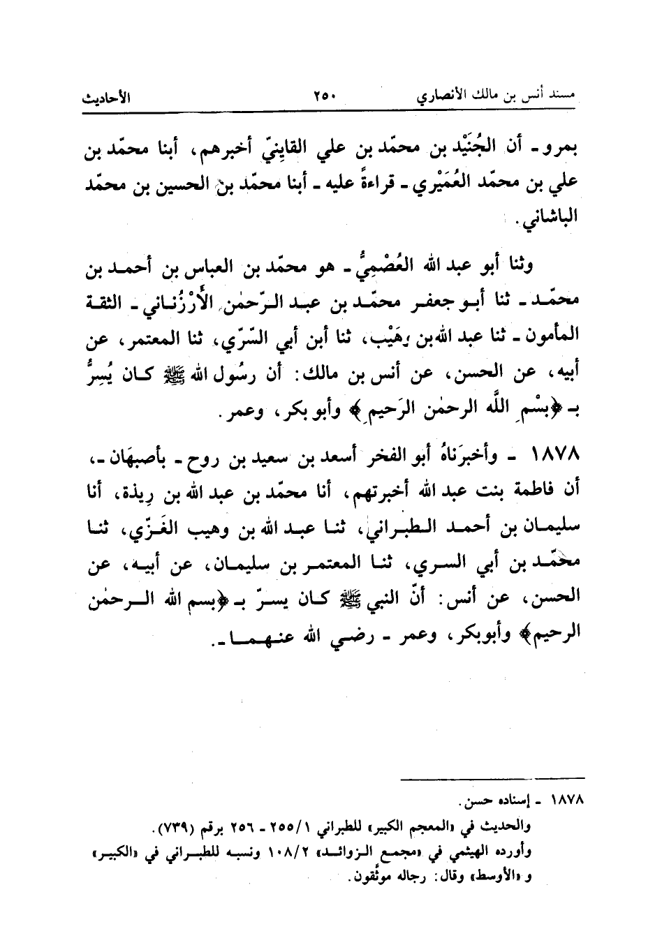 1878 - وَأَخْبَرَنَاهُ أَبُو الْفَخْرِ أَسْعَدُ بْنُ سَعِيدِ بْنِ رَوْحٍ بِأَصْبَهَانَ أَنَّ فَاطِمَةَ بِنْتَ عَبْدِ اللَّهِ أَخْبَرَتْهُمْ أَنا مُحَمَّدُ بْنُ عَبْدِ اللَّهِ بْنِ رِيذَةَ أَنَا سُلَيْمَانُ بْنُ أَحْمَدَ الطَّبَرَانِيُّ ثَنَا عَبْدُ اللَّهِ بْنُ وُهَيْبٍ الْغَزِّيُّ ثَنَا مُحَمَّدُ بْنُ أَبِي السَّرِيِّ ثَنَا الْمُعْتَمِرُ بْنُ سُلَيْمَانَ عَنْ أَبِيهِ عَنِ الْحَسَنِ عَنْ أَنَسٍ أَنَّ النَّبِيَّ صَلَّى اللَّهُ عَلَيْهِ وَسَلَّمَ كَانَ يُسِرُّ ب {بِسم الله الرَّحْمَن الرَّحِيم} وَأَبُو بَكْرٍ وَعُمَرُ رَضِيَ اللَّهُ عَنْهُمَا