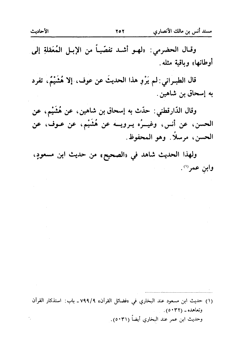 وَقَالَ الْحَضْرَمِيُّ لَهُوَ أَشَدُّ تَفَصِّيًا مِنَ الإِبِلِ الْمُعَقَّلَةِ إِلَى أَوْطَانِهَا وَبَاقِيهِ مِثْلُهُ قَالَ الطَّبَرَانِيُّ لَمْ يَرْوِ هَذَا الْحَدِيثَ عَنْ عَوْفٍ إِلا هُشَيْمٌ تَفَرَّدَ بِهِ إِسْحَاقُ بْنُ شَاهِينَ وَقَالَ الدَّارَقُطْنِيُّ حَدَّثَ بِهِ إِسْحَاقُ بْنُ شَاهِينَ عَنْ هُشَيْمٍ عَنِ الْحَسَنِ عَنْ أَنَسٍ وَغَيْرِهِ يَرْوِيهِ عَنْ هُشَيْمٍ عَنْ عَوْفٍ عَنِ الْحَسَنِ مُرْسَلا وَهُوَ الْمَحْفُوظُ وَلِهَذَا الْحَدِيثِ شَاهِدٌ فِي الصَّحِيحِ مِنْ حَدِيثِ ابْنِ مَسْعُودٍ وَابْنِ عُمَرَ
