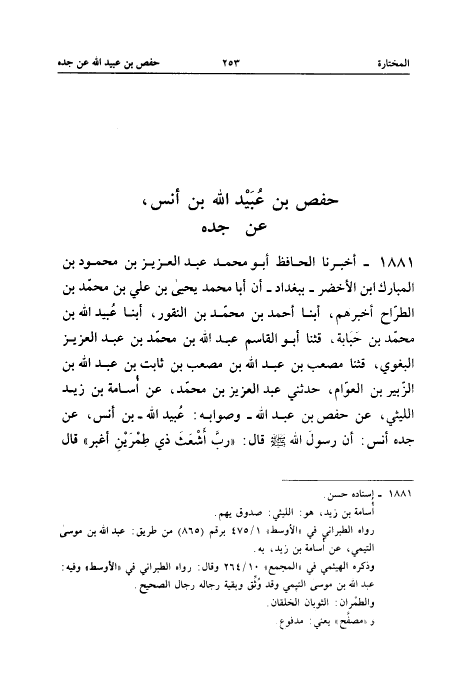 1881 - أَخْبَرَنَا الْحَافِظُ أَبُو مُحَمَّدٍ عَبْدُ الْعَزِيزِ بْنُ مَحْمُودِ بْنِ الْمُبَارَكِ ابْنِ الأَخْضَرِ بِبَغْدَادَ أَنَّ أَبَا مُحَمَّدٍ يَحْيَى بْنَ عَلِيِّ بْنِ مُحَمَّدِ بْنِ الطَّرَّاحِ أَخْبَرَهُمْ أبنا أَحْمَدُ بْنُ مُحَمَّدِ بن النقور أبنا عُبَيْدُ اللَّهِ بْنُ مُحَمَّدِ بْنِ حُبَابَةَ قثنا أَبُو الْقَاسِمِ عَبْدُ اللَّهِ بْنُ مُحَمَّدِ بْنِ عَبْدِ الْعَزِيزِ الْبَغَوِيُّ قثنا مُصْعَبُ بْنُ عَبْدِ اللَّهِ بْنِ مُصْعَبِ بْنِ ثَابِتِ بْنِ عَبْدِ اللَّهِ بْنِ الزُّبَيْرِ بْنِ الْعَوَّامِ حَدَّثَنِي عَبْدُ الْعَزِيزِ بْنُ مُحَمَّدٍ عَنْ أُسَامَةَ بْنِ زَيْدٍ اللَّيْثِيِّ عَنْ حَفْصِ بْنِ عَبْدِ اللَّهِ وَصَوَابُهُ عُبَيْدُ اللَّهِ بْنُ أَنَسٍ عَنْ جَدِّهِ أَنَسٍ أَنَّ رَسُولَ اللَّهِ صَلَّى اللَّهُ عَلَيْهِ وَسَلَّمَ قَالَ رُبَّ أَشْعَثَ ذِي طِمْرَيْنِ أَغْبَرَ قَالَ