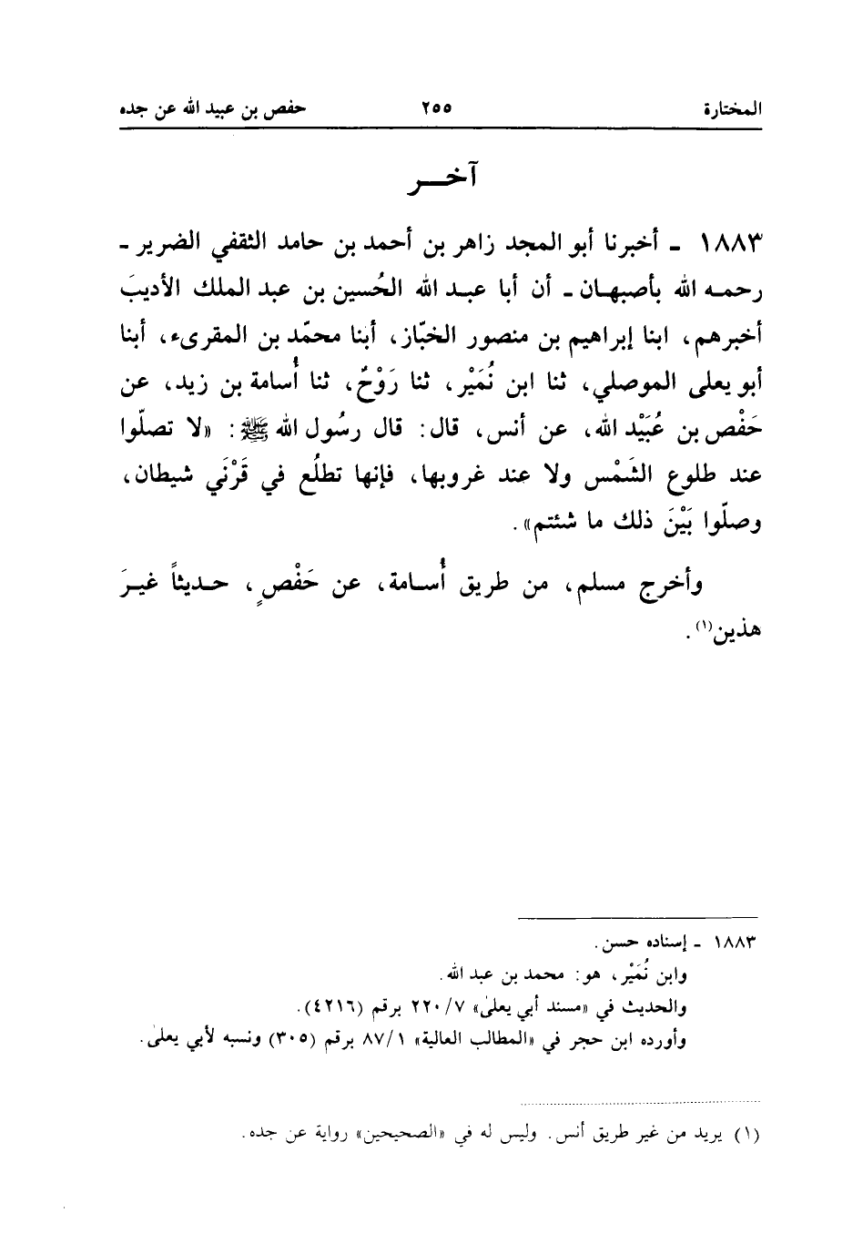 1883 - أَخْبَرَنَا أَبُو الْمَجْدِ زَاهِرُ بْنُ أَحْمَدَ بْنِ حَامِدٍ الثَّقَفِيُّ الضَّرِيرُ رَحِمَهُ اللَّهُ بِأَصْبَهَانَ أَنَّ أَبَا عَبْدِ اللَّهِ الْحُسَيْنَ بْنَ عَبْدِ الْمَلِكِ الأَدِيبَ أَخْبَرَهُمْ أبنا إِبْرَاهِيمُ بْنُ مَنْصُورٍ الْخَبَّازُ أبنا مُحَمَّد بن الْمُقْرِئُ أبنا أَبُو يَعْلَى الْمَوْصِلِيُّ ثَنَا ابْنُ نُمَيْرٍ ثَنَا رَوْحٌ ثَنَا أُسَامَةُ بْنُ زَيْدٍ عَنْ حَفْصِ بْنِ عُبَيْدِ اللَّهِ عَنْ أَنَسٍ قَالَ قَالَ رَسُولُ اللَّهِ صَلَّى اللَّهُ عَلَيْهِ وَسَلَّمَ لَا تُصَلُّوا عِنْدَ طُلُوعِ الشَّمْسِ وَلا عِنْدَ غُرُوبِهَا فَإِنَّهَا تَطْلُعُ فِي قَرْنَيْ شَيْطَانٍ وَصَلُّوا بَيْنَ ذَلِكَ مَا شِئْتُمْ وَأَخْرَجَ مُسْلِمٌ مِنْ طَرِيقِ أُسَامَةَ عَنْ حَفْصٍ حَدِيثًا غَيْرَ هذَيْن