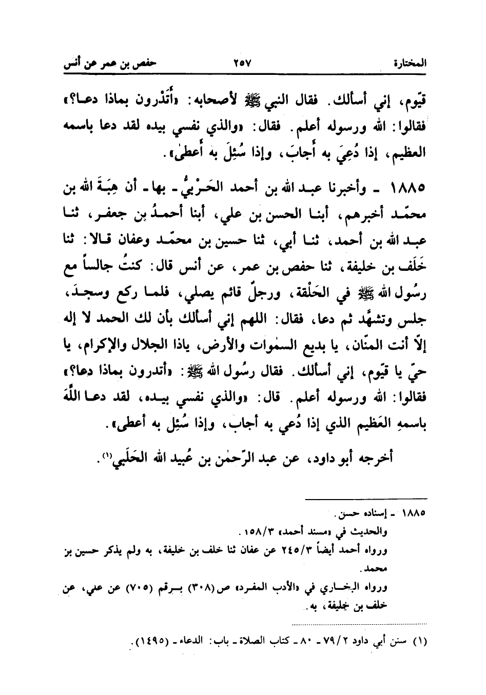 1885 - وَأَخْبَرَنَا عَبْدُ اللَّهِ بْنُ أَحْمَدَ الْحَرْبِيُّ بِهَا أَنَّ هِبَةَ اللَّهِ بْنَ مُحَمَّدٍ أَخْبَرَهُمْ أبنا الْحَسَنُ بْنُ عَلِيٍّ ابْنَا أَحْمَدَ بْنِ جَعْفَرٍ ثَنَا عَبْدُ اللَّهِ بْنُ أَحْمَدَ ثَنَا أَبِي ثَنَا حُسَيْنُ بْنُ مُحَمَّدٍ وَعَفَّانُ قَالا ثَنَا خَلَفُ بْنُ خَلِيفَةَ ثَنَا حَفْصُ بْنُ عُمَرَ عَنْ أَنَسٍ قَالَ كُنْتُ جَالِسًا مَعَ رَسُولِ اللَّهِ صَلَّى اللَّهُ عَلَيْهِ وَسَلَّمَ فِي الْحَلْقَةِ وَرَجُلٌ قَائِمٌ يُصَلِّي فَلَمَّا رَكَعَ وَسَجَدَ جَلَسَ وَتَشَهَّدَ ثُمَّ دَعَا فَقَالَ اللَّهُمَّ إِنِّي أَسْأَلُكَ بِأَنَّ لَكَ الْحَمْدُ لَا إِلَهَ إِلا أَنْتَ المنان يَا بديع السَّمَوَات وَالْأَرْض يَاذَا الْجَلالِ وَالإِكْرَامِ يَا حَيُّ يَا قَيُّومُ إِنِّي أَسْأَلُكَ فَقَالَ رَسُولُ اللَّهِ صَلَّى اللَّهُ عَلَيْهِ وَسَلَّمَ أَتَدْرُونَ بِمَاذَا دَعَا فَقَالُوا اللَّهُ وَرَسُولُهُ أَعْلَمُ قَالَ وَالَّذِي نَفْسِي بِيَدِهِ لَقَدْ دَعَا اللَّهَ بِاسْمِهِ الْعَظِيمِ الَّذِي إِذَا دُعِيَ بِهِ أجَاب وَإِذا سُئِلَ بِهِ أعْطى أخرجه أَو دَاوُدَ عَنْ عَبْدِ الرَّحْمَنِ بْنِ عُبَيْدِ اللَّهِ الْحلَبِي