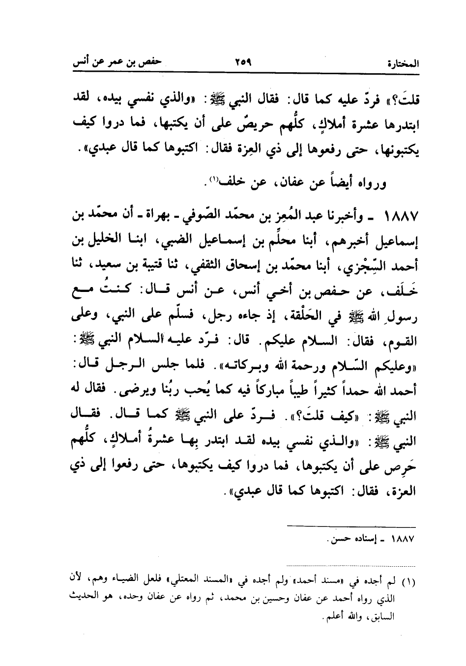 1887 - وَأَخْبَرَنَا عَبْدُ الْمُعِزِّ بْنُ مُحَمَّدٍ الصُّوفِيُّ بِهَرَاةَ أَن مُحَمَّد بن إِسْمَاعِيل أَخْبَرَهُمْ أبنا محْلَمُ بْنُ إِسْمَاعِيلَ الضَّبِّيُّ أبنا الْخَلِيلُ بْنُ أَحْمَدَ الْسِجْزِيُّ أبنا مُحَمَّدُ بْنُ إِسْحَاقَ الثَّقَفِيُّ ثَنَا قُتَيْبَةُ بْنُ سَعِيدٍ ثَنَا خلف عَن حَفْص بن أَخِي أَنَسٍ عَنْ أَنَسٍ قَالَ كُنْتُ مَعَ رَسُولَ اللَّهِ صَلَّى اللَّهُ عَلَيْهِ وَسَلَّمَ فِي الْحَلْقَةِ إِذْ جَاءَهُ رَجُلٌ فَسَلَّمَ عَلَى النَّبِيِّ وَعَلَى الْقَوْمِ فَقَالَ السَّلامُ عَلَيْكُمْ قَالَ فَرَدَّ عَلَيْهِ السَّلامَ النَّبِيُّ صَلَّى اللَّهُ عَلَيْهِ وَسَلَّمَ وَعَلَيْكُمُ السَّلامُ وَرَحْمَةُ اللَّهِ وَبَرَكَاتُهُ فَلَمَّا جَلَسَ الرَّجُلُ قَالَ أَحْمَدُ اللَّهَ حَمْدًا كَثِيرًا طَيِّبًا مُبَارَكًا فِيهِ كَمَا يُحِبُّ رَبُّنَا وَيَرْضَى فَقَالَ لَهُ النَّبِيُّ صَلَّى اللَّهُ عَلَيْهِ وَسَلَّمَ كَيْفَ قُلْتَ فَرَدَّ عَلَى النَّبِيِّ صَلَّى اللَّهُ عَلَيْهِ وَسَلَّمَ كَمَا قَالَ فَقَالَ النَّبِيُّ صَلَّى اللَّهُ عَلَيْهِ وَسَلَّمَ وَالَّذِي نَفْسِي بِيَدِهِ لَقَدِ ابْتَدَرَ بِهَا عَشَرَةُ أَمْلاكٍ كُلُّهُمْ حَرَصَ عَلَى أَنْ يكتوبها فَمَا دَرُوا كَيْفَ يَكْتُبُوهَا حَتَّى رَفَعُوا إِلَى ذِي الْعِزَّةِ فَقَالَ اكْتُبُوهَا كَمَا قَالَ عَبْدِي