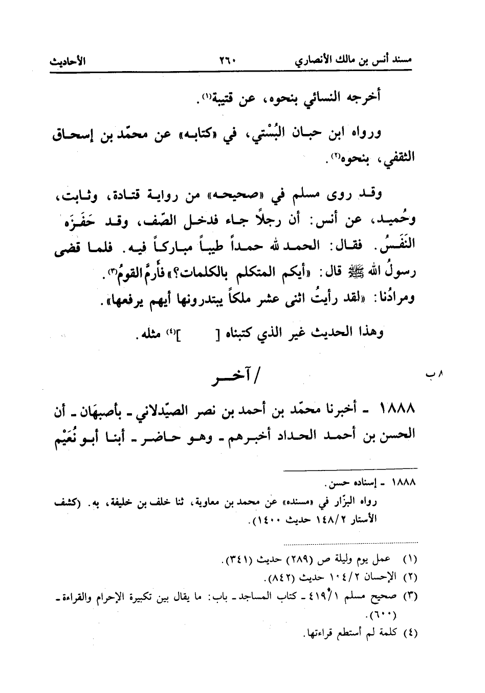 أَخْرَجَهُ النَّسَائِيُّ بِنَحْوِهِ عَنْ قُتَيْبَةَ وَرَوَاهُ ابْنُ حِبَّانَ الْبُسْتِيُّ فِي كِتَابِهِ عَنْ مُحَمَّدِ بْنِ إِسْحَاقَ الثَّقَفِيِّ بِنَحْوِهِ وَقَدْ رَوَى مُسْلِمٌ فِي صَحِيحِهِ مِنْ رِوَايَةِ قَتَادَةَ وَثَابِتٍ وَحُمَيْدٍ عَنْ أَنَسٍ أَنَّ رَجُلا جَاءَ فَدَخَلَ الصَّفَّ وَقَدْ حَفَزَهُ النَّفَسُ فَقَالَ الْحَمْدُ لِلَّهِ حَمْدًا طَيِّبًا مُبَارَكًا فِيهِ فَلَمَّا قَضَى رَسُولُ اللَّهِ صَلَّى اللَّهُ عَلَيْهِ وَسَلَّمَ قَالَ أَيُّكُمُ الْمُتَكَلِّمُ بِالْكَلِمَاتِ فَأَرَمَّ الْقَوْمُ وَمُرَادُنَا لَقَدْ رَأَيْتُ اثْنَيْ عَشَرَ ملكا يبتدرونها أَيهمْ يرفعها وَهَذَا الحَدِيث غير الَّذِي كتبناه [] مثله