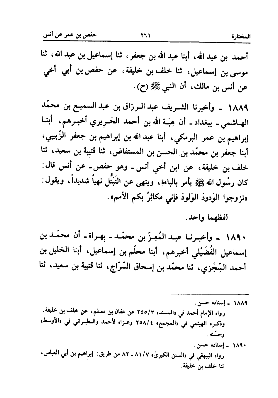 1889 - وَأَخْبَرَنَا الشَّرِيفُ عَبْدُ الرَّزَّاقِ بْنُ عَبْدِ السَّمِيعِ بْنِ مُحَمَّدٍ الْهَاشِمِيُّ بِبَغْدَادَ أَنَّ هِبَةَ اللَّهِ بن أَحْمد الْحَرِيرِيَّ أَخْبَرَهُمْ أبنا إِبْرَاهِيمُ بْنُ عُمَرَ الْبَرْمَكِيُّ أبنا عَبْدُ اللَّهِ بْنُ إِبْرَاهِيمَ بْنِ جَعْفَرِ الزبيبي أبنا جَعْفَرُ بْنُ مُحَمَّدِ بْنِ الْحَسَنِ بْنِ الْمُسْتَفَاضِ ثَنَا قُتَيْبَةُ بْنُ سَعِيدٍ ثَنَا خَلَفُ بْنُ خَلِيفَةَ عَنِ ابْنِ أَخِي أَنَسٍ وَهُوَ حَفْصٌ عَنْ أَنَسٍ قَالَ كَانَ رَسُولُ اللَّهِ صَلَّى اللَّهُ عَلَيْهِ وَسَلَّمَ يَأْمُرُ بِالْبَاءَةِ وَيَنْهَى عَنِ التَّبَتُّلِ نَهْيًا شَدِيدًا وَيَقُولُ تَزَوَّجُوا الْوَدُودَ الْوَلُودَ فَإِنِّي مُكَاثِر بكم الْأُمَم لَفْظهمَا وَاحِد إِسْنَاده حسن
