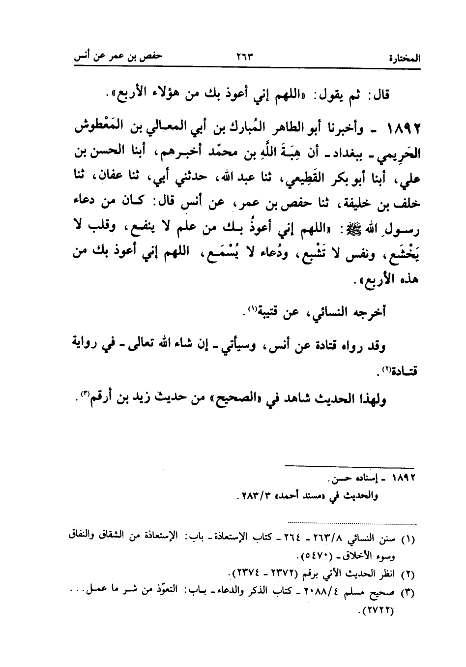 1892 - وَأَخْبَرَنَا أَبُو الطَّاهِرِ الْمُبَارَكُ بْنُ أَبِي الْمَعَالِي بْنُ الْمَعْطُوشِ الْحَرِيمِيُّ بِبَغْدَادَ أَنَّ هِبَةَ اللَّهِ بْنَ مُحَمَّدٍ أَخْبَرَهُمْ أبنا الْحَسَنُ بْنُ عَلِيٍّ أبنا أَبُو بَكْرٍ الْقَطِيعِيُّ ثَنَا عَبْدُ اللَّهِ حَدَّثَنِي أَبِي ثَنَا عَفَّانُ ثَنَا خَلَفُ بْنُ خَلِيفَةَ ثَنَا حَفْصُ بْنُ عُمَرَ عَنْ أَنَسٍ قَالَ كَانَ مِنْ دُعَاءِ رَسُولِ اللَّهِ صَلَّى اللَّهُ عَلَيْهِ وَسَلَّمَ اللَّهُمَّ إِنِّي أَعُوذُ بِكَ مِنْ عِلْمٍ لَا يَنْفَعُ وَقَلْبٍ لَا يَخْشَعُ وَنَفس لَا تشبع وَدُعَاء لَا يسمع الله إِنِّي أَعُوذُ بِكَ مِنْ هَذِهِ الأَرْبَعِ أَخْرَجَهُ النَّسَائِيُّ عَنْ قُتَيْبَةَ وَقَدْ رَوَاهُ قَتَادَةُ عَنْ أَنَسٍ وَسَيَأْتِي إِنْ شَاءَ اللَّهُ تَعَالَى فِي رِوَايَةِ قَتَادَةَ وَلِهَذَا الْحَدِيثِ شَاهِدٌ فِي الصَّحِيحِ من حَدِيث زيد بن أَرقم