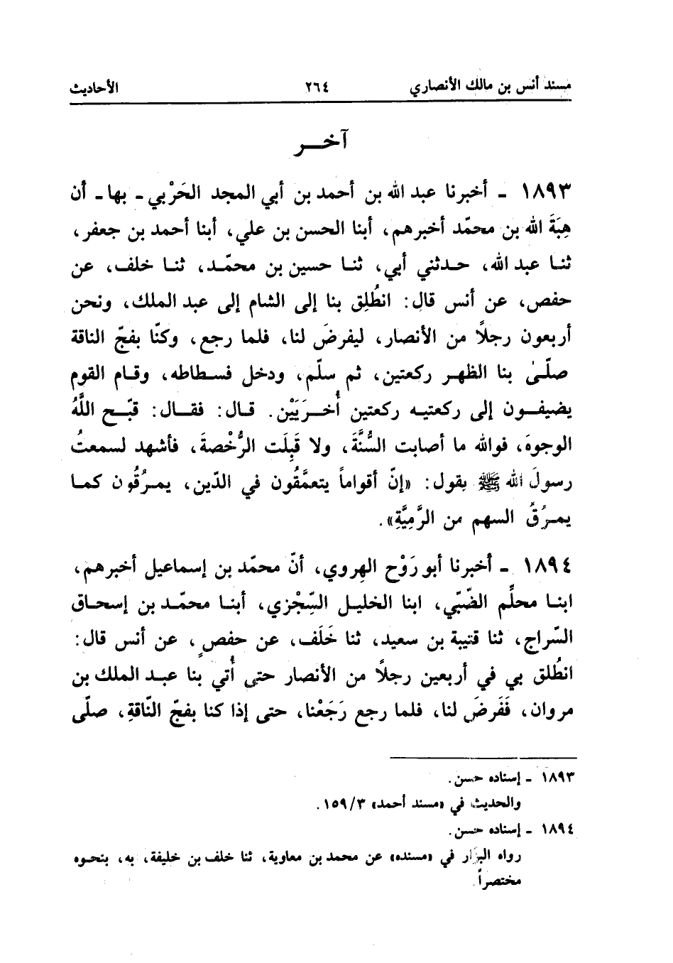 1893 - أَخْبَرَنَا عَبْدُ اللَّهِ بْنُ أَحْمَدَ بْنِ أَبِي الْمَجْدِ الْحَرْبِيُّ بِهَا أَنَّ هِبَةَ اللَّهِ بْنَ مُحَمَّدٍ أَخْبَرَهُمْ أبنا الْحَسَنُ بْنُ عَلِيٍّ أبنا أَحْمَدُ بْنُ جَعْفَرٍ ثَنَا عَبْدُ اللَّهِ حَدَّثَنِي أَبِي ثَنَا حُسَيْنُ بْنُ مُحَمَّدٍ ثَنَا خَلَفٌ عَنْ حَفْصٍ عَنْ أَنَسٍ قَالَ انْطُلِقَ بِنَا إِلَى الشَّامِ إِلَى عَبْدِ الْمَلِكِ وَنَحْنُ أَرْبَعُونَ رَجُلا مِنَ الأَنْصَارِ لِيَفْرِضَ لَنَا فَلَمَّا رَجَعَ وَكُنَّا بِفَجِّ النَّاقَةِ صَلَّى بِنَا الظُّهْرَ رَكْعَتَيْنِ ثُمَّ سَلَّمَ وَدَخَلَ فُسْطَاطَهُ وَقَامَ الْقَوْمُ يُضِيفُونَ إِلَى رَكْعَتَيْهِ رَكْعَتَيْنِ أُخْرَيَيْنِ قَالَ فَقَالَ قَبَّحَ اللَّهُ الْوُجُوهَ فَوَاللَّهِ مَا أَصَابَتِ السُّنَّةَ وَلا قَبِلَتِ الرُّخْصَةَ فَأَشْهَدُ لَسَمِعْتُ رَسُولَ اللَّهِ صَلَّى اللَّهُ عَلَيْهِ وَسَلَّمَ يَقُولُ إِنَّ أَقْوَامًا يَتَعَمَّقُونَ فِي الدِّينِ يَمْرُقُونَ كَمَا يَمْرُقُ السَّهْمُ مِنَ الرَّمية إِسْنَاده حسن