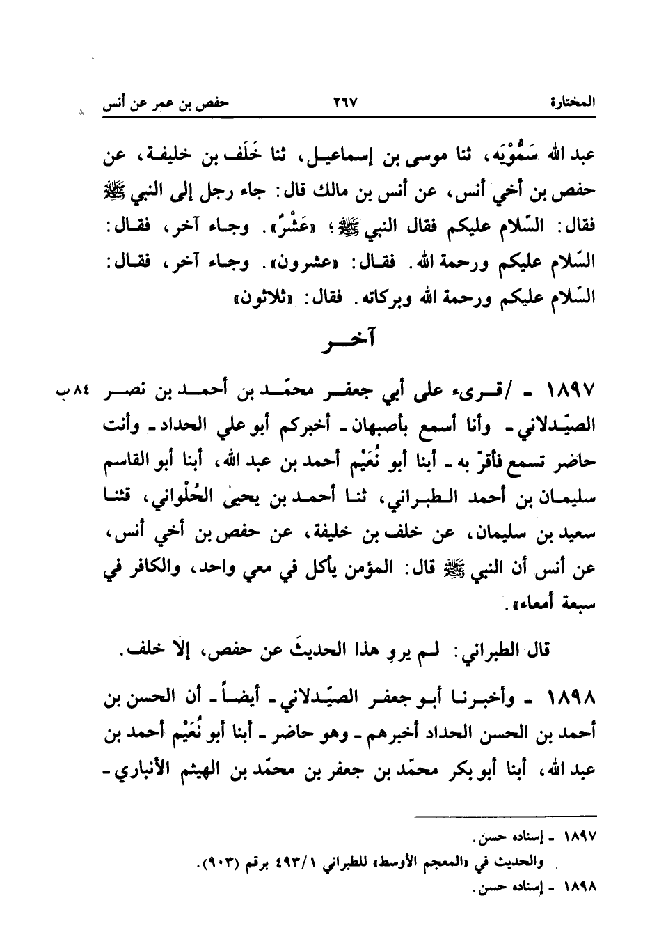 1897 - قُرِئَ عَلَى أَبِي جَعْفَرٍ مُحَمَّدُ بْنُ أَحْمَدَ بْنِ نَصْرٍ الصَّيْدَلانِيُّ وَأَنَا أَسْمَعُ بِأَصْبَهَانَ أَخْبَرَكُمْ أَبُو عَلِيٍّ الْحَدَّادُ وَأَنْتَ حَاضِرٌ تَسْمَعُ فَأَقَرَّ بِهِ أبنا أَبُو نُعَيْمٍ أَحْمَدُ بْنُ عَبْدِ اللَّهِ أبنا أَبُو الْقَاسِمِ سُلَيْمَانُ بْنُ أَحْمَدَ الطَّبَرَانِيُّ ثَنَا أَحْمَدُ بْنُ يَحْيَى الْحُلْوَانِيُّ قثنا سَعِيدُ بْنُ سُلَيْمَانَ عَنْ خَلَفِ بْنِ خَلِيفَةَ عَنْ حَفْص بن أَخِي أَنَسٍ عَنْ أَنَسٍ أَنَّ النَّبِيَّ صَلَّى اللَّهُ عَلَيْهِ وَسَلَّمَ قَالَ الْمُؤْمِنُ يَأْكُلُ فِي مَعِيٍّ وَاحِدٍ وَالْكَافِرُ فِي سَبْعَةِ أَمْعَاءٍ قَالَ الطَّبَرَانِيُّ لَمْ يَرْوِ هَذَا الْحَدِيثَ عَنْ حَفْصٍ إِلَّا خلف إِسْنَاده حسن