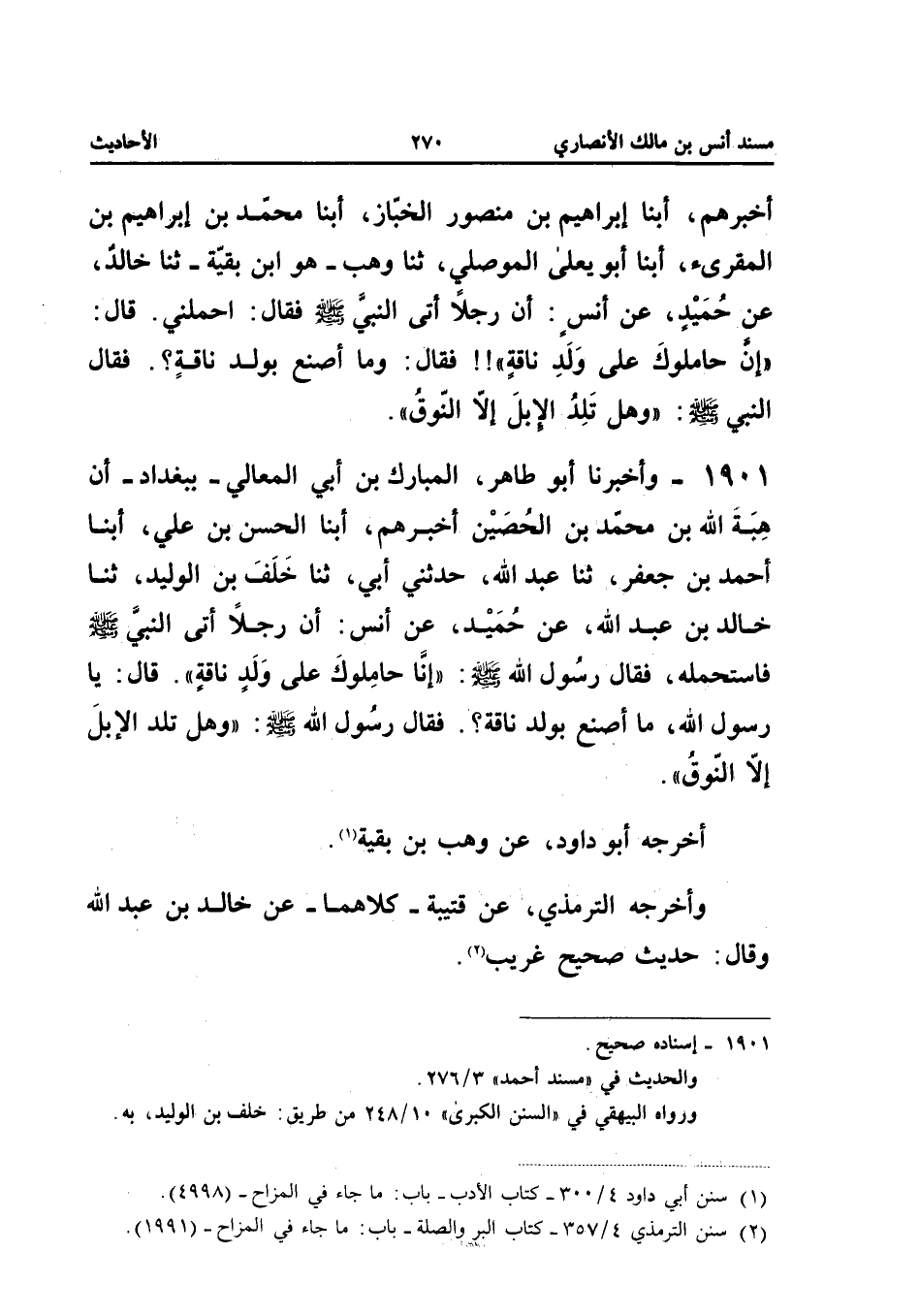 1901 - وَأَخْبَرَنَا أَبُو طَاهِرٍ الْمُبَارَكُ بْنُ أَبِي الْمَعَالِي بِبَغْدَادَ أَنَّ هِبَةَ اللَّهِ بْنَ مُحَمَّدِ بْنِ الْحصين أَخْبَرَهُمْ أبنا الْحَسَنُ بْنُ عَلِيٍّ أبنا أَحْمَدُ بْنُ جَعْفَرٍ ثَنَا عَبْدُ اللَّهِ حَدَّثَنِي أَبِي ثَنَا خَلَفُ بْنُ الْوَلِيدِ ثَنَا خَالِدُ بْنُ عَبْدِ اللَّهِ عَنْ حُمَيْدٍ عَنْ أَنَسٍ أَنَّ رَجُلا أَتَى النَّبِيَّ صَلَّى اللَّهُ عَلَيْهِ وَسَلَّمَ فَاسْتَحْمَلَهُ فَقَالَ رَسُولُ اللَّهِ صَلَّى اللَّهُ عَلَيْهِ وَسَلَّمَ إِنَّا حَامِلُوكَ عَلَى وَلَدِ نَاقَةٍ قَالَ يَا رَسُولَ اللَّهِ مَا أَصْنَعُ بِوَلَدِ نَاقَةٍ فَقَالَ رَسُولُ اللَّهِ صَلَّى اللَّهُ عَلَيْهِ وَسَلَّمَ وَهَلْ تَلِدُ الإِبِلُ إِلا النُّوقَ أَخْرَجَهُ أَبُو دَاوُدَ عَنْ وَهْبِ بْنِ بَقِيَّةَ وَأَخْرَجَهُ التِّرْمِذِيُّ عَنْ قُتَيْبَةَ كِلاهُمَا عَنْ خَالِدِ بْنِ عَبْدِ الله وَقَالَ حَدِيث صَحِيح غَرِيب