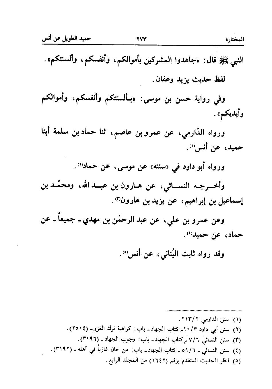 قَالَ جَاهِدُوا الْمُشْرِكِينَ بِأَمْوَالِكُمْ وَأَنْفُسِكُمْ وَأَلْسِنَتِكُمْ لَفْظُ حَدِيثِ يَزِيدَ وَعَفَّانَ وَفِي رِوَايَةِ حَسَنِ بْنِ مُوسَى بِأَلْسِنَتِكُمْ وَأَنْفُسِكُمْ وَأَمْوَالِكُمْ وَأَيْدِيكُمْ وَرَوَاهُ الدَّارِمِيُّ عَنْ عَمْرِو بْنِ عَاصِمٍ ثَنَا حَمَّادُ بْنُ سَلمَة أبنا حُمَيْدٌ عَنْ أَنَسٍ وَرَوَاهُ أَبُو دَاوُدَ فِي سُنَنِهِ عَنْ مُوسَى عَنْ حَمَّادٍ وَأَخْرَجَهُ النَّسَائِيُّ عَنْ هَارُونَ بْنِ عَبْدِ اللَّهِ وَمُحَمَّدِ بْنِ إِسْمَاعِيلَ بْنِ إِبْرَاهِيمَ عَنْ يَزِيدَ بْنِ هَارُونَ وَعَنْ عَمْرِو بْنِ عَلِيٍّ عَنْ عَبْدِ الرَّحْمَنِ بْنِ مَهْدِيٍّ جَمِيعًا عَنْ حَمَّادٍ عَنْ حُمَيْدٍ وَقَدْ رَوَاهُ ثَابِتٌ الْبُنَانِيُّ عَنْ أَنَسٍ