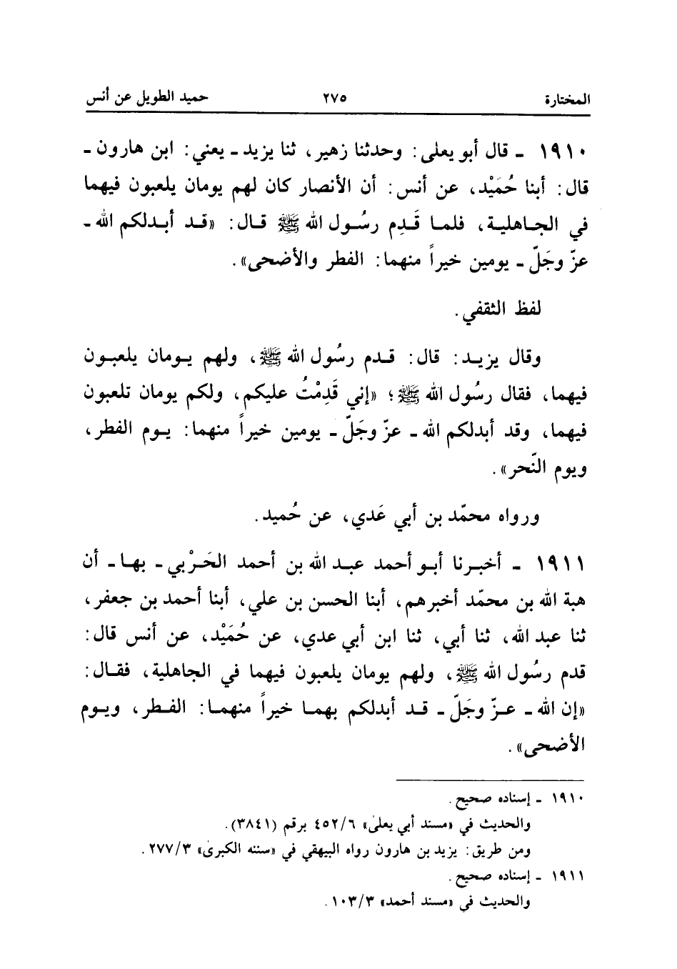 1910 - قَالَ أَبُو يَعْلَى وَحَدَّثَنَا زُهَيْرٌ ثَنَا يَزِيدُ يَعْنِي ابْن هَارُون قَالَ أبنا حُمَيْدٌ عَنْ أَنَسٍ أَنَّ الأَنْصَارَ كَانَ لَهُمْ يَوْمَانِ يَلْعَبُونَ فِيهِمَا فِي الْجَاهِلِيَّةِ فَلَمَّا قَدِمَ رَسُولَ اللَّهِ صَلَّى اللَّهُ عَلَيْهِ وَسَلَّمَ قَالَ قَدْ أَبْدَلَكُمُ اللَّهُ عَزَّ وَجَلَّ يَوْمَيْنِ خَيْرًا مِنْهُمَا الْفِطْرُ وَالأَضْحَى لَفْظُ الثَّقَفِيِّ وَقَالَ يَزِيدُ قَالَ قَدِمَ رَسُولُ اللَّهِ صَلَّى اللَّهُ عَلَيْهِ وَسَلَّمَ وَلَهُمْ يَوْمَانِ يَلْعَبُونَ فِيهِمَا فَقَالَ رَسُولُ اللَّهِ صَلَّى اللَّهُ عَلَيْهِ وَسَلَّمَ إِنِّي قَدِمْتُ عَلَيْكُمْ وَلَكُمْ يَوْمَانِ تَلْعَبُونَ فِيهِمَا وَقَدْ أَبْدَلَكُمُ اللَّهُ عَزَّ وَجَلَّ يَوْمَيْنِ خَيْرًا مِنْهُمَا يَوْمَ الْفِطْرِ وَيَوْمَ النَّحْرِ وَرَوَاهُ مُحَمَّدُ بْنُ أَبِي عدي عَن حميد إِسْنَاده صَحِيح