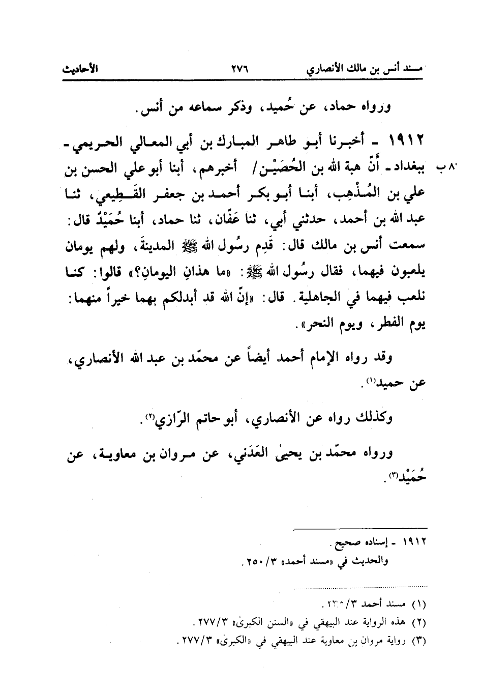 1912 - أَخْبَرَنَا أَبُو طَاهِرٍ الْمُبَارَكُ بْنُ أَبِي الْمَعَالِي الْحَرِيمِيُّ بِبَغْدَادَ أَنَّ هِبَةَ اللَّهِ بْنَ الْحُصَيْنِ أَخْبَرَهُمْ أبنا أَبُو عَلِيٍّ الْحَسَنُ بْنُ عَلِيٍّ بْنِ الْمُذْهِبِ أبنا أَبُو بَكْرٍ أَحْمَدُ بْنُ جَعْفَرٍ الْقَطِيعِيُّ ثَنَا عَبْدُ اللَّهِ بْنُ أَحْمَدَ حَدَّثَنِي أَبِي ثَنَا عَفَّانُ ثَنَا حَمَّادٌ أبنا حُمَيْدٌ قَالَ سَمِعْتُ أَنَسَ بْنَ مَالِكٍ قَالَ قَدِمَ رَسُولُ اللَّهِ صَلَّى اللَّهُ عَلَيْهِ وَسَلَّمَ الْمَدِينَةَ وَلَهُمْ يَوْمَانِ يَلْعَبُونَ فِيهِمَا فَقَالَ رَسُولُ اللَّهِ صَلَّى اللَّهُ عَلَيْهِ وَسَلَّمَ مَا هَذَا الْيَوْمَانِ قَالُوا كُنَّا نَلْعَبُ فِيهِمَا فِي الْجَاهِلِيَّةِ قَالَ إِنَّ اللَّهَ قَدْ أَبْدَلَكُمْ بِهِمَا خَيْرًا مِنْهُمَا يَوْمَ الْفِطْرِ وَيَوْمَ النَّحْرِ وَقَدْ رَوَاهُ الإِمَامُ أَحْمَدُ أَيْضًا عَنْ مُحَمَّدِ بْنِ عَبْدِ اللَّهِ الأَنْصَارِيِّ عَنْ حُمَيْدٍ وَكَذَلِكَ رَوَاهُ عَنِ الأَنْصَارِيِّ أَبُو حَاتِمٍ الرَّازِيُّ وَرَوَاهُ مُحَمَّدُ بْنُ يَحْيَى الْعَدَنِيُّ عَنْ مَرْوَانَ بْنِ مُعَاوِيَةَ عَنْ حميد