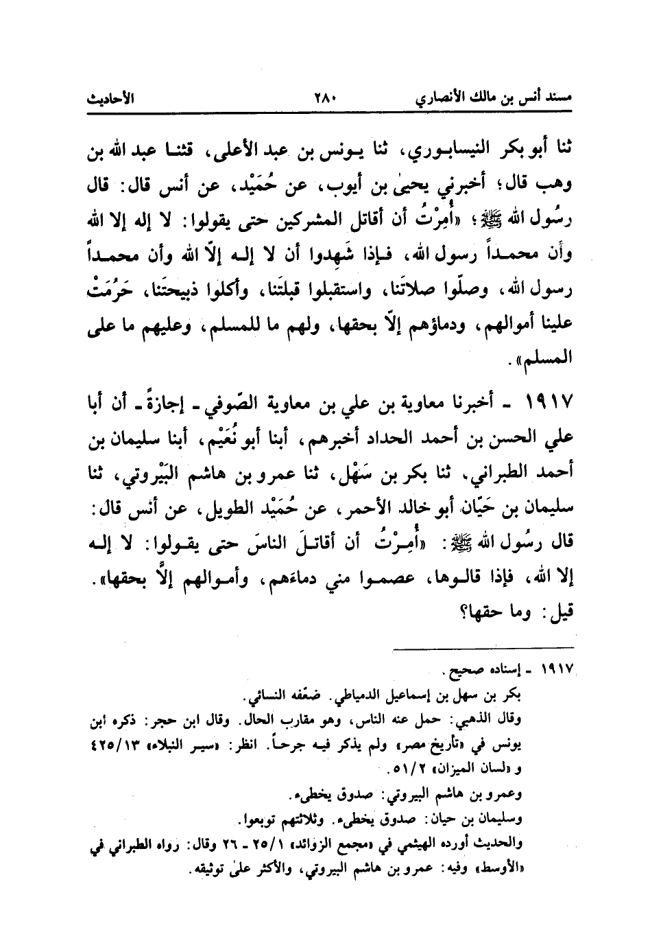 1917 - أَخْبَرَنَا مُعَاوِيَةُ بْنُ عَلِيِّ بْنِ مُعَاوِيَةَ الصُّوفِيُّ إِجَازَةً أَنَّ أَبَا عَلِيٍّ الْحَسَنَ بْنَ أَحْمَدَ الْحَدَّادَ أَخْبَرَهُمْ أبنا أَبُو نُعَيْمٍ أبنا سُلَيْمَانُ بْنُ أَحْمَدَ الطَّبَرَانِيُّ ثَنَا بَكْرُ بْنُ سَهْلٍ ثَنَا عَمْرُو بْنُ هَاشِمٍ الْبَيْرُوتِيُّ ثَنَا سُلَيْمَانُ بْنُ حَيَّانَ أَبُو خَالِدٍ الأَحْمَرُ عَنْ حُمَيْدٍ الطَّوِيلِ عَنْ أَنَسٍ قَالَ قَالَ رَسُولُ اللَّهِ صَلَّى اللَّهُ عَلَيْهِ وَسَلَّمَ أُمِرْتُ أَنْ أُقَاتِلَ النَّاسَ حَتَّى يَقُولُوا لَا إِلَهَ إِلا اللَّهُ فَإِذَا قَالُوهَا عَصَمُوا مِنِّي دِمَاءَهُمْ وَأَمْوَالَهُمْ إِلا بِحَقِّهَا قِيلَ وَمَا حَقُّهَا