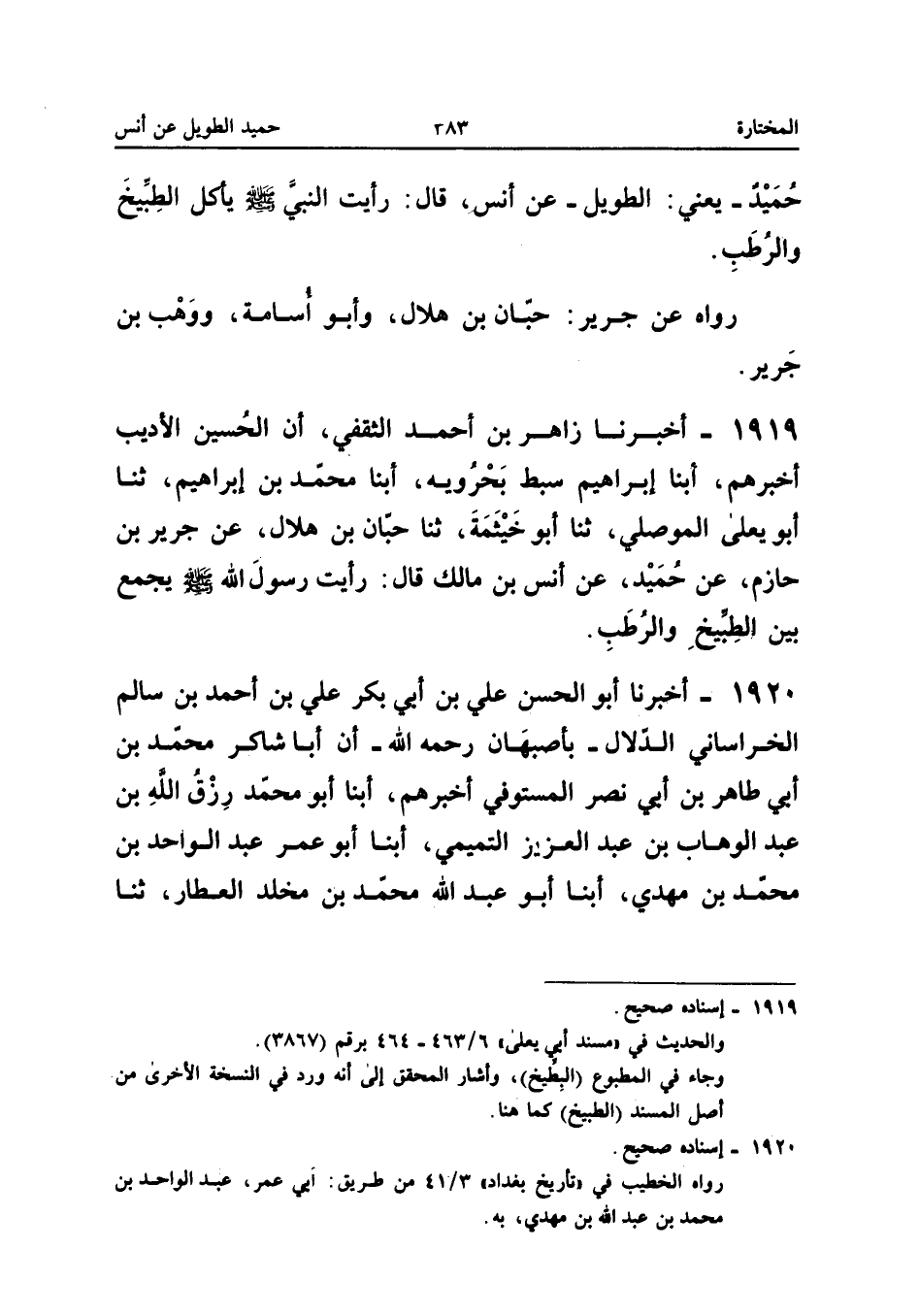 1919 - أَخْبَرَنَا زَاهِرُ بْنُ أَحْمَدَ الثَّقَفِيُّ أَنَّ الْحُسَيْنَ الأدِيبَ أَخْبَرَهُمْ أبنا إِبْرَاهِيمُ سِبْطُ بَحْرُوَيْهِ أبنا مُحَمَّدُ بْنُ إِبْرَاهِيمَ ثَنَا أَبُو يَعْلَى الْمَوْصِلِيُّ ثَنَا أَبُو خَيْثَمَةَ ثَنَا حِبَّانَ بْنَ هِلالٍ عَنْ جَرِيرِ بْنِ حَازِمٍ عَنْ حُمَيْدٍ عَنْ أَنَسَ بْنَ مَالِكٍ قَالَ رَأَيْتُ رَسُولَ اللَّهِ صلى الله عَلَيْهِ وَسلم يجمع بَين الطبيخ وَالرّطب إِسْنَاده صَحِيح