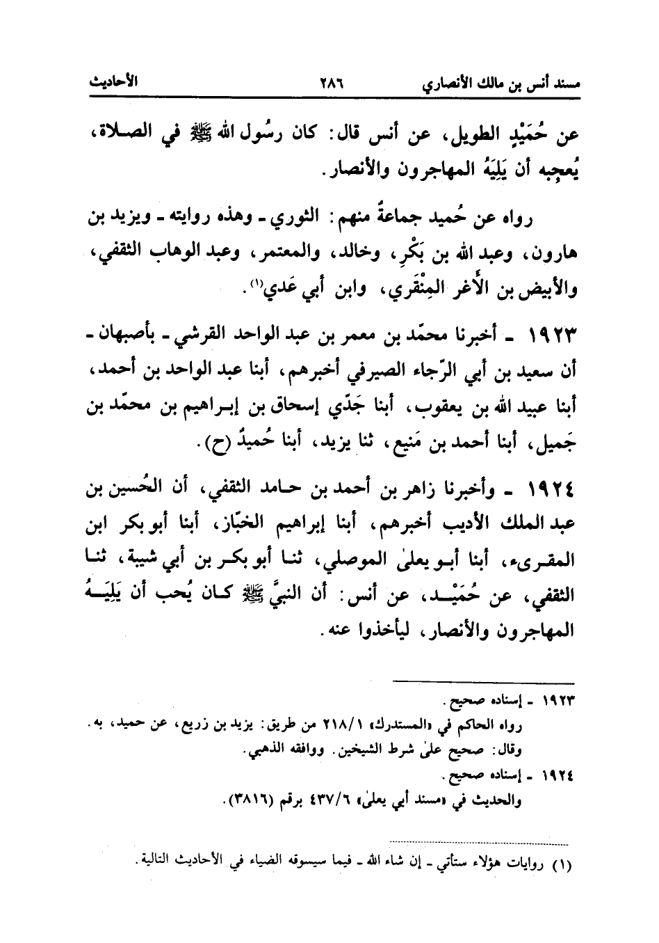فِي الصَّلاةِ يُعْجِبُهُ أَنْ يَلِيَهُ الْمُهَاجِرُونَ وَالأَنْصَارُ رَوَاهُ عَنْ حُمَيْدٍ جَمَاعَةٌ مِنْهُمُ الثَّوْرِيُّ وَهَذِهِ رِوَايَته وَيزِيد بن هَارُون وَعبد الله بن بكر وخَالِد والمعتمر وَعبد الْوَهَّابِ الثَّقَفِيُّ وَالأَبْيَضُ بْنُ الأَغَرِّ الْمِنْقَرِيُّ وَابْنُ أبي عدي إِسْنَاده صَحِيح