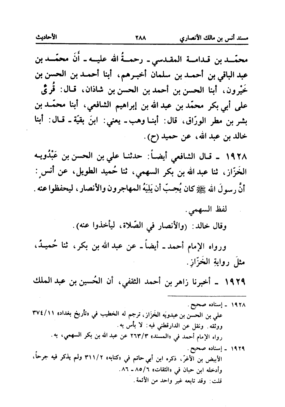 1928 - قَالَ الشَّافِعِيُّ أَيْضًا حَدَّثَنَا عَلِيُّ بْنُ الْحَسَنِ بْنِ عَبْدَوَيْهِ الْخَزَّازُ ثَنَا عَبْدُ اللَّهِ بْنُ بَكْرٍ السَّهْمِيُّ ثَنَا حُمَيْدٌ الطَّوِيلُ عَنْ أَنَسٍ إِنَّ رَسُولَ اللَّهِ صَلَّى اللَّهُ عَلَيْهِ وَسَلَّمَ كَانَ يُحِبُّ أَنْ يَلِيَهُ الْمُهَاجِرُونَ وَالأَنْصَارُ لِيَحْفَظُوا عَنْهُ لَفْظُ السَّهْمِيِّ وَقَالَ خَالِدٌ (وَالأَنْصَارُ فِي الصَّلاةِ لِيَأْخُذُوا عَنْهُ) وَرَوَاهُ الإِمَامُ أَحْمَدُ أَيْضًا عَنْ عَبْدِ اللَّهِ بْنِ بَكْرٍ ثَنَا حُمَيْدٌ مثل رِوَايَة الخزاز إِسْنَاده صَحِيح