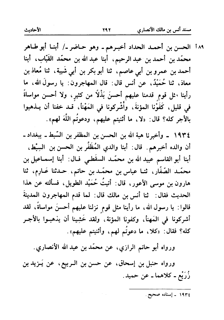 1934 - وَأَخْبَرَنَا هِبَةُ اللَّهِ بْنُ الْحَسَنِ بْنِ الْمُظَفَّرِ بْنِ السِّبْطِ بِبَغْدَادَ أَنَّ وَالِدَهُ أَخْبَرَهُمْ قَالَ أبنا وَالِدي الْمُظَفَّرُ بْنُ الْحَسَنِ بْنِ السِّبْطِ أبنا أَبُو الْقَاسِمِ عُبَيْدُ اللَّهِ بْنُ مُحَمَّدٍ السَّقَطِيُّ قَالَ أبنا إِسْمَاعِيلُ بْنُ مُحَمَّدٍ الصَّفَّارُ ثَنَا عَبَّاسُ بْنُ مُحَمَّدِ بْنِ حَاتِمٍ حَدَّثَنَا عَارِمٌ ثَنَا هَارُونُ بن مُوسَى الْأَعْوَر قَالَ أتيت حميد الطَّوِيلَ فَسَأَلْتُهُ عَنْ هَذَا الْحَدِيثِ فَقَالَ ثَنَا أنس بن مَالك قَالَ لما قدم المهارجون الْمَدِينَةَ قَالُوا يَا رَسُولَ اللَّهِ مَا رَأَيْنَا مثل قوم نزلنَا عليم أَحْسَنَ مُوَاسَاةً لَقَدْ أَشْرَكُونَا فِي الْمَهْنَإ وَكَفَوْنَا الْمُؤْنَةَ وَلَقَدْ خَشِينَا أَنْ يَذْهَبُوا بِالأَجْرِ كُلِّهِ فَقَالَ كَلا مَا دَعَوْتُمْ لَهُمْ وَأَثْنَيْتُمْ عَلَيْهِمْ وَرَوَاهُ أَبُو حَاتِمٍ الرَّازِيُّ عَنْ مُحَمَّدِ بْنِ عَبْدِ اللَّهِ الأَنْصَارِيِّ وَرَوَاهُ حَنْبَلُ بْنُ إِسْحَاقَ عَنْ حَسَنِ بْنِ الرَّبِيعِ عَنْ يَزِيدَ بْنِ زُرَيْعٍ كِلاهُمَا عَنْ حُمَيْدٍ