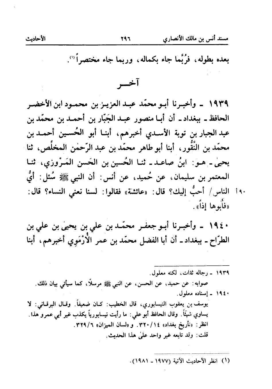 1939 - وَأَخْبَرَنَا أَبُو مُحَمَّدٍ عَبْدُ الْعَزِيزِ بْنُ مَحْمُودِ ابْنِ الأَخْضَرِ الْحَافِظُ بِبَغْدَادَ 0 أَنَّ أَبَا مَنْصُورٍ عَبْدَ الْجَبَّارِ بْنَ أَحْمَدَ بْنِ مُحَمَّدِ بْنِ عَبْدِ الْجَبَّار بن تَوْبَة الْأَسدي أَخْبَرَهُمْ أبنا أَبُو الْحُسَيْنِ أَحْمَدُ بْنُ مُحَمَّدِ بن النقور أبنا أَبُو طَاهِرٍ مُحَمَّدُ بْنُ عَبْدِ الرَّحْمَنِ الْمُخَلِّصُ ثَنَا يَحْيَى هُوَ ابْنُ صَاعِدٍ ثَنَا الْحُسَيْنُ بْنُ الْحَسَنِ الْمَرْوَزِيُّ ثَنَا الْمُعْتَمِرُ بْنُ سُلَيْمَانَ عَنْ حُمَيْدٍ عَنْ أَنَسٍ أَنَّ النَّبِيَّ صَلَّى اللَّهُ عَلَيْهِ وَسَلَّمَ سُئِلَ أَيُّ النَّاسِ أَحَبُّ إِلَيْكَ قَالَ عَائِشَةُ فَقَالُوا لَسْنَا نَعْنِي النِّسَاء قَالَ فأبوها إِذا إِسْنَاده مَعْلُول