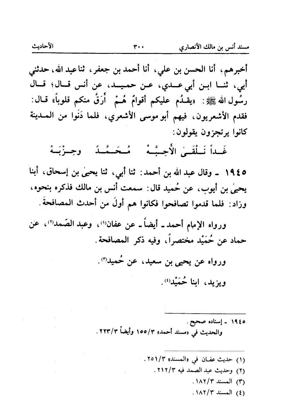 1945 - وَقَالَ عَبْدُ اللَّهِ بْنُ أَحْمَدَ ثَنَا أَبِي ثَنَا يحيى بن إِسْحَاق أبنا يَحْيَى بْنُ أَيُّوبَ عَنْ حُمَيْدٍ قَالَ سَمِعْتُ أَنَسَ بْنَ مَالِكٍ فَذَكَرَهُ بِنَحْوِهِ وَزَادَ فَلَمَّا قَدِمُوا تَصَافَحُوا فَكَانُوا هُمْ أَوَّلَ مَنْ أَحْدَثَ الْمُصَافَحَةَ وَرَوَاهُ الإِمَامُ أَحْمَدُ أَيْضًا عَنْ عَفَّانَ وَعبد الصَّمَدِ عَنْ حَمَّادٍ عَنْ حُمَيْدٍ مُخْتَصَرًا وَفِيهِ ذِكْرُ الْمُصَافَحَةِ وَرَوَاهُ عَنْ يَحْيَى بْنِ سَعِيدٍ عَن حميد وَيزِيد ابْنا حميد