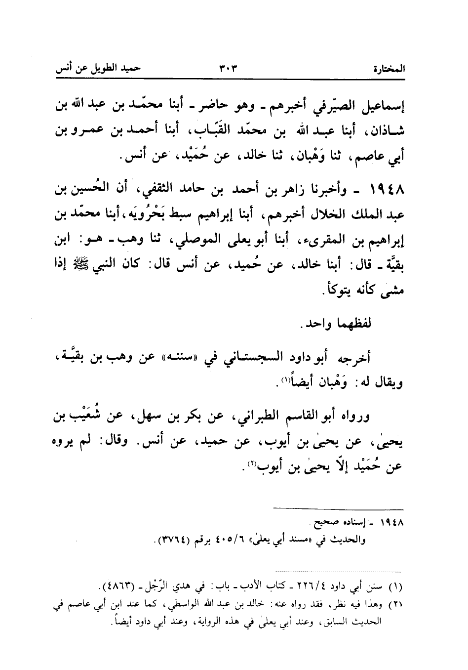 1948 - وَأَخْبَرَنَا زَاهِرُ بْنُ أَحْمَدَ بْنِ حَامِدٍ الثَّقَفِيُّ أَنَّ الْحُسَيْنَ بْنَ عَبْدِ الْمَلِكِ الْخَلالَ أَخْبَرَهُمْ أبنا إِبْرَاهِيمُ سِبْطُ بَحْرُوَيْهِ أبنا مُحَمَّدُ بْنُ إِبْرَاهِيم بن الْمُقْرِئِ أبنا أَبُو يَعْلَى الْمَوْصِلِيُّ ثَنَا وَهْبٌ هُوَ ابْن بَقِيَّة قَالَ أبنا خَالِدٌ عَنْ حُمَيْدٍ عَنْ أَنَسٍ قَالَ كَانَ النَّبِيُّ صَلَّى اللَّهُ عَلَيْهِ وَسَلَّمَ إِذَا مَشَى كَأَنَّهُ يَتَوَكَّأُ لَفْظُهُمَا وَاحِدٌ أَخْرَجَهُ أَبُو دَاوُدَ السِّجِسْتَانِيُّ فِي سُنَنِهِ عَنْ وَهْبِ بْنِ بَقِيَّةَ وَيُقَالُ لَهُ وَهْبَانُ أَيْضًا وَرَوَاهُ أَبُو الْقَاسِمِ الطَّبَرَانِيُّ عَنْ بَكْرِ بْنِ سَهْلٍ عَنْ شُعَيْبِ بْنِ يَحْيَى عَنْ يَحْيَى بْنِ أَيُّوبَ عَنْ حُمَيْدٍ عَنْ أَنَسٍ وَقَالَ لَمْ يَرْوِهِ عَنْ حميد إِلَّا يحيى بن أَيُّوب