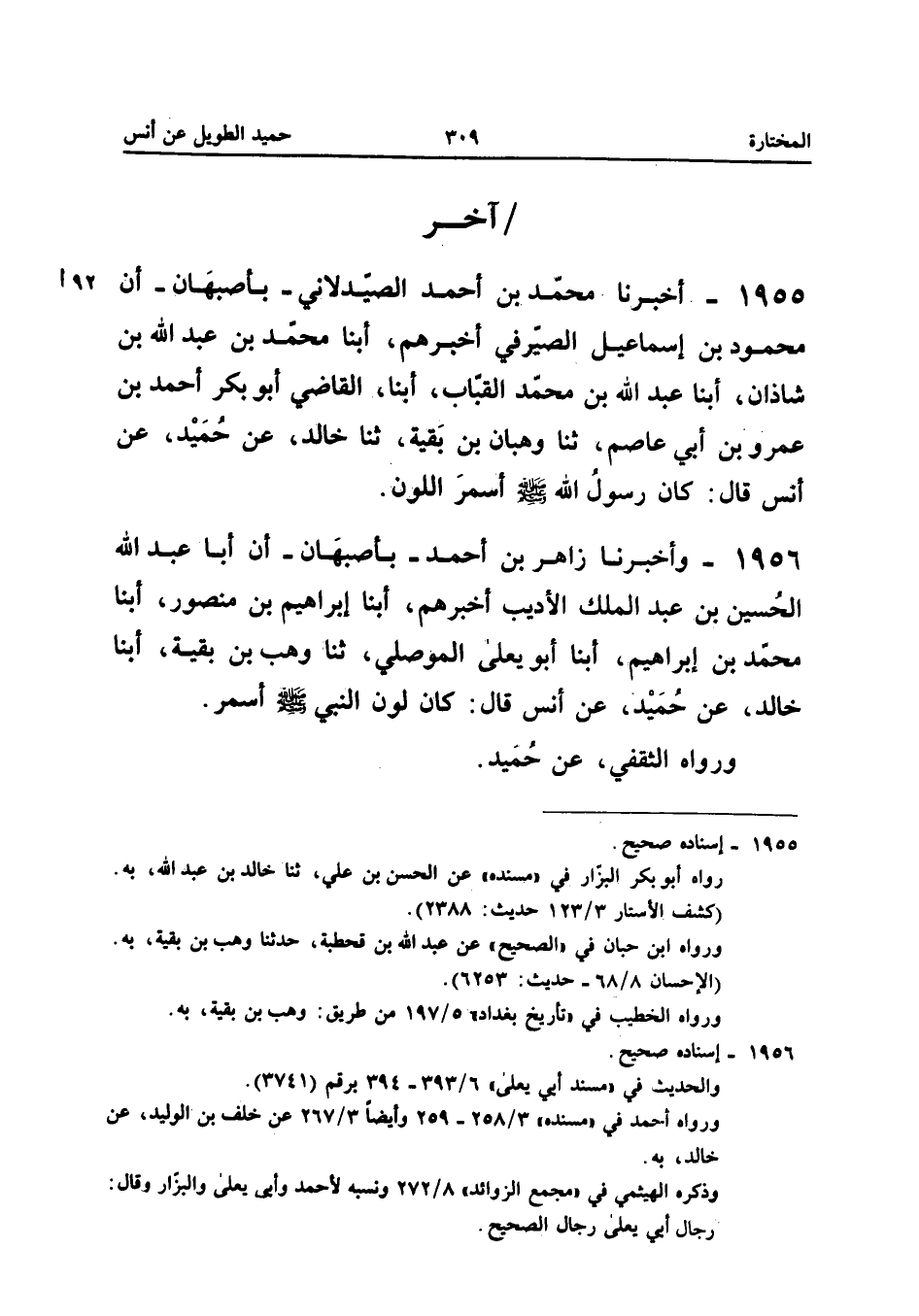 1955 - أَخْبَرَنَا مُحَمَّدُ بْنُ أَحْمَدَ الصَّيْدَلانِيُّ بِأَصْبَهَانَ أَنَّ مَحْمُودَ بْنَ إِسْمَاعِيلَ الصَّيْرَفِيَّ أَخْبَرَهُمْ أبنا مُحَمَّدُ بْنُ عَبْدِ اللَّهِ بْنِ شَاذَانَ أبنا عَبْدُ اللَّهِ بْنُ مُحَمَّدٍ الْقَبَّابُ أبنا الْقَاضِي أَبُو بَكْرٍ أَحْمَدُ بْنُ عَمْرِو بْنِ أَبِي عَاصِمٍ ثَنَا وَهْبَانُ بْنُ بَقِيَّةَ ثَنَا خَالِدٌ عَنْ حُمَيْدٍ عَنْ أَنَسٍ قَالَ كَانَ رَسُولُ اللَّهِ صلى الله عَلَيْهِ وَسلم أسمر اللَّوْن إِسْنَاده صَحِيح