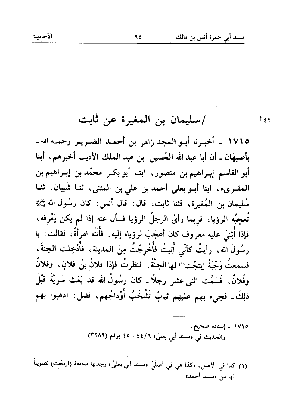 1715 - أَخْبَرَنَا أَبُو الْمَجْدِ زَاهِرُ بْنُ أَحْمَدَ الضَّرِيرُ رَحِمَهُ اللَّهُ بِأَصْبَهَانَ أَنَّ أَبَا عَبْدِ اللَّهِ الْحُسَيْنَ بْنَ عَبْدِ الْمَلِكِ الأدِيبَ أَخْبَرَهُمْ أبنا أَبُو الْقَاسِمِ إِبْرَاهِيمُ بْنُ مَنْصُورٍ أبنا أَبُو بكر مُحَمَّد بن إِبْرَاهِيم بن الْمُقْرِئِ أبنا أَبُو يَعْلَى أَحْمَدُ بْنُ عَلِيِّ بْنِ الْمُثَنَّى ثَنَا شَيْبَانُ ثَنَا سُلَيْمَانُ بْنُ الْمُغِيرَةِ قثنا ثَابِتٌ قَالَ قَالَ أَنَسٌ كَانَ رَسُولُ اللَّهِ صَلَّى اللَّهُ عَلَيْهِ وَسَلَّمَ تُعْجِبُهُ الرُّؤْيَا فَرُبَّمَا رَأَى الرَّجُلُ الرُّؤْيَا فَسَأَلَ عَنْهُ إِذَا لَمْ يَكُنْ يَعْرِفْهُ فَإِذَا أُثْنِيَ عَلَيْهِ مَعْرُوفٌ كَانَ أَعْجَبَ لِرُؤْيَاهُ إِلَيْهِ فَأَتَتْهُ امْرَأَةٌ فَقَالَتْ يَا رَسُولَ اللَّهِ رَأَيْتُ كَأَنِّي أُتِيتُ فَأُخْرِجْتُ مِنَ الْمَدِينَةِ فَأُدْخِلْتُ الْجَنَّةَ فَسَمِعْتُ وَجْبَةً إيتجت لَهَا الْجَنَّةُ فَنَظَرْتُ فَإِذَا فُلانُ بْنُ فُلانٍ وَفُلانٌ وَفُلانٌ فَسَمَّتِ اثْنَيْ عَشَرَ رَجُلا كَانَ رَسُول الله قَدْ بَعَثَ سَرِيَّةً قَبْلَ ذَلِكَ فَجِيءَ بِهِمْ عَلَيْهِمْ ثِيَابٌ تَشْخَبُ أَوْدَاجُهُمْ فَقِيلَ اذْهَبُوا بِهِمْ
