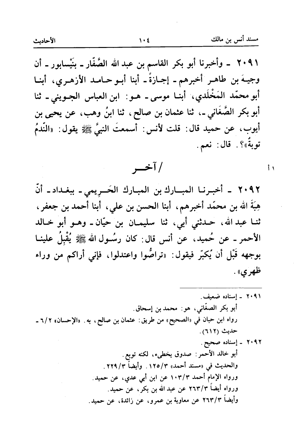 2091 - وَأَخْبَرَنَا أَبُو بَكْرٍ الْقَاسِمُ بْنُ عَبْدِ اللَّهِ الصَّفَّارُ بِنَيْسَابُورَ أَنَّ وَجِيهَ بْنَ طَاهِرٍ أَخْبَرَهُمْ إِجَازَةً أبنا أَبُو حَامِدٍ الأَزْهَرِيُّ أبنا أَبُو مُحَمَّدٍ الْمَخْلَدِيُّ أبنا مُوسَى هُوَ ابْنُ الْعَبَّاسِ الْجُوَيْنِيُّ ثَنَا أَبُو بَكْرٍ الصَّغَانِيُّ ثَنَا عُثْمَانُ بْنُ صَالِحٍ ثَنَا ابْنُ وَهْبٍ عَنْ يَحْيَى بْنِ أَيُّوبَ عَنْ حُمَيْدٍ قَالَ قُلْتُ لأَنَسٍ أَسَمِعْتَ النَّبِيَّ صَلَّى اللَّهُ عَلَيْهِ وَسَلَّمَ يَقُولُ النَّدَم تَوْبَة قَالَ نعم