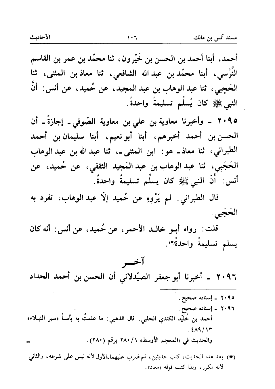قَالَ الطَّبَرَانِيُّ لَمْ يَرْوِهِ عَنْ حُمَيْدٍ إِلا عَبْدُ الْوَهَّابِ تَفَرَّدَ بِهِ الْحَجَبِيُّ قُلْتُ رَوَاهُ أَبُو خَالِدٍ الأَحْمَرُ عَنْ حُمَيْدٍ عَنْ أَنَسٍ أَنَّهُ كَانَ يسلم تَسْلِيمَة وَاحِدَة