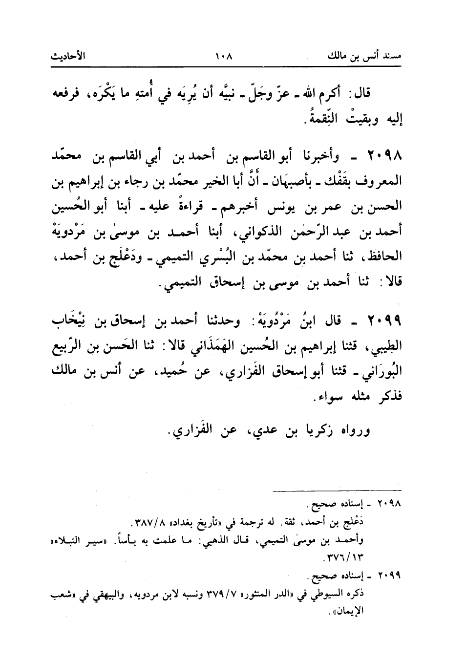 2099 - قَالَ ابْنُ مَرْدُوَيْهِ وَحَدَّثَنَا أَحْمَدُ بْنُ إِسْحَاقَ بْنِ نيخَاب الطِّيبِيُّ قثنا إِبْرَاهِيمُ بْنُ الْحُسَيْنِ الْهَمَذَانِيُّ قَالا ثَنَا الْحَسَنُ بْنُ الرَّبِيعِ الْبُورَانِيُّ قثنا أَبُو إِسْحَاقَ الْفَزَارِيُّ عَنْ حُمَيْدٍ عَنْ أَنَسِ بْنِ مَالِكٍ فَذَكَرَ مِثْلَهُ سَوَاءً وَرَوَاهُ زَكَرِيَّا بن عدي عَن الْفَزارِيّ إِسْنَاده صَحِيح