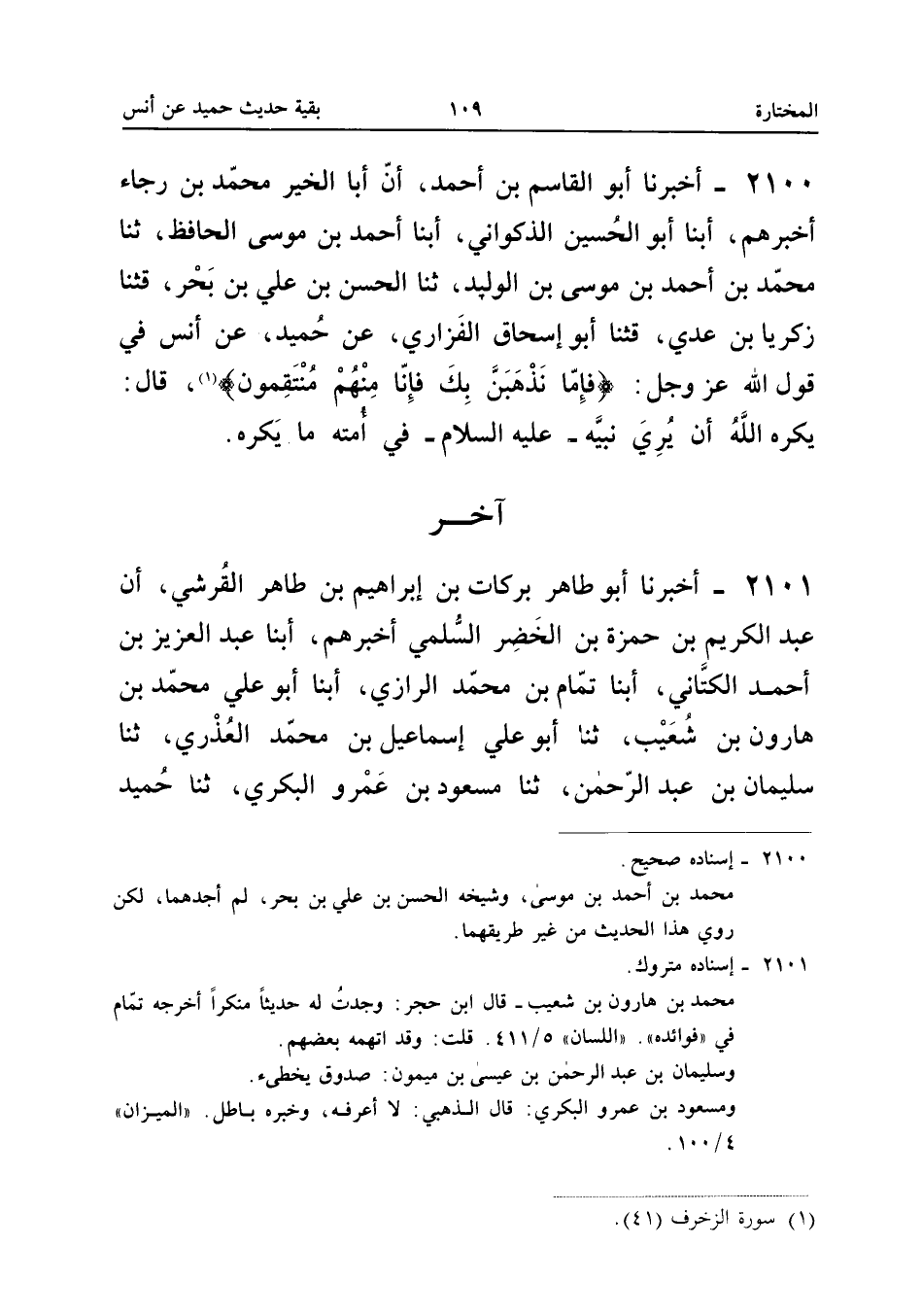 2100 - أَخْبَرَنَا أَبُو الْقَاسِمِ بْنُ أَحْمَدَ أَنَّ أَبَا الْخَيْرِ مُحَمَّدَ بْنَ رَجَاءٍ أَخْبَرَهُمْ أبنا أَبُو الْحُسَيْنِ الذَّكْوَانِيُّ أبنا أَحْمَدُ بْنُ مُوسَى الْحَافِظُ ثَنَا مُحَمَّدُ بْنُ أَحْمَدَ بْنِ مُوسَى بْنِ الْوَلِيدِ ثَنَا الْحَسَنُ بْنُ عَلِيِّ بْنِ بَحْرٍ قثنا زَكَرِيَّا بْنُ عَدِيٍّ قثنا أَبُو إِسْحَاقَ الْفَزَارِيُّ عَنْ حُمَيْدٍ عَنْ أَنَسٍ فِي قَوْلِ اللَّهِ عَزَّ وَجَلَّ {فَإِمَّا نَذْهَبَنَّ بِكَ فَإِنَّا مِنْهُم منتقمون} قَالَ يَكْرَهُ اللَّهُ أَنْ يُرِيَ نَبِيَّهُ عَلَيْهِ السَّلَام فِي أمته مَا يكره
