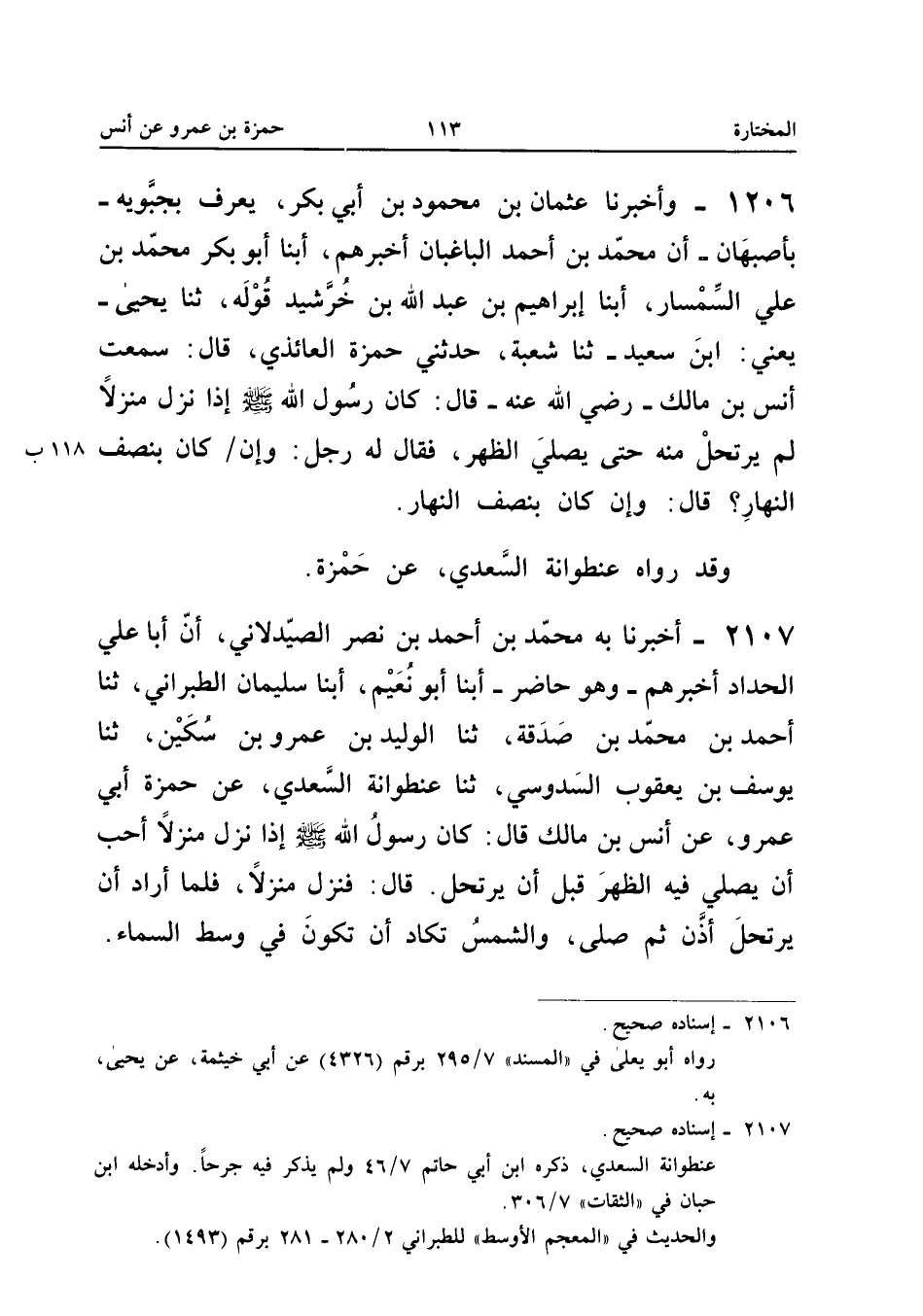 2107 - أَخْبَرَنَا بِهِ مُحَمَّدُ بْنُ أَحْمَدَ بْنِ نَصْرٍ الصَّيْدَلانِيُّ أَنَّ أَبَا عَلِيٍّ الْحَدَّادَ أخبرهُمْ وَهُوَ حَاضِرٌ أبنا أَبُو نُعَيْمٍ أبنا سُلَيْمَانُ الطَّبَرَانِيُّ ثَنَا أَحْمَدُ بْنُ مُحَمَّدِ بْنِ صَدَقَةَ ثَنَا الْوَلِيدُ بْنُ عَمْرِو بْنِ سُكَيْنٍ ثَنَا يُوسُفُ بْنُ يَعْقُوبَ السَّدُوسِيُّ ثَنَا عنطوانةُ السَّعْدِيُّ عَنْ حَمْزَةَ أَبِي عَمْرٍو عَنْ أَنَسِ بْنِ مَالِكٍ قَالَ كَانَ رَسُولُ اللَّهِ صَلَّى اللَّهُ عَلَيْهِ وَسَلَّمَ إِذَا نَزَلَ مَنْزِلا أَحَبَّ أَنْ يُصَلِّيَ فِيهِ الظُّهْرَ قَبْلَ أَنْ يَرْتَحِلَ قَالَ فَنَزَلَ منزلا فَلَمَّا أرد أَنْ يَتْرَحِلَ أَذَّنَ ثُمَّ صَلَّى وَالشَّمْسُ تَكَادُ أَنْ تَكُونَ فِي وَسَطِ السَّمَاءِ