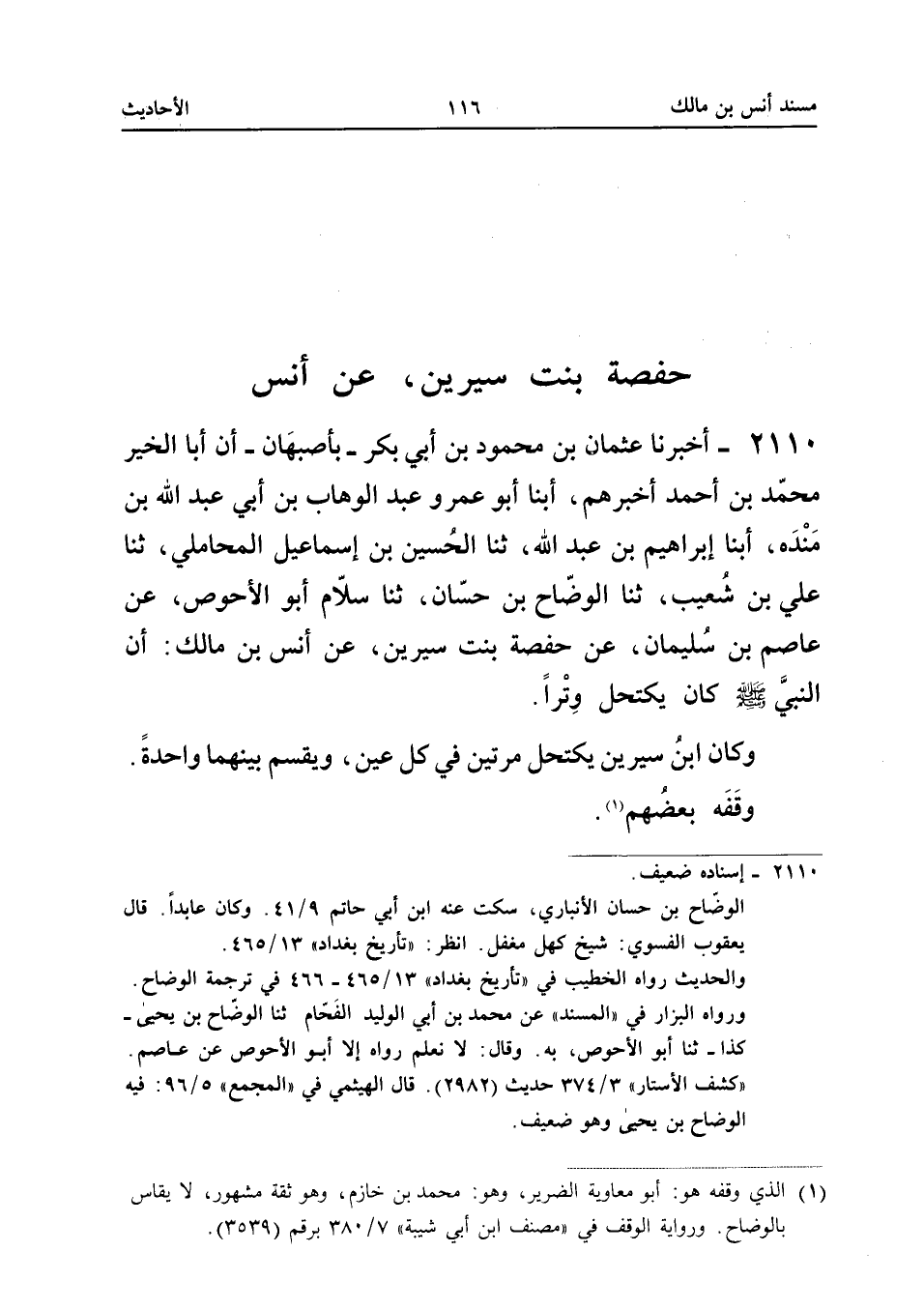 2110 - أَخْبَرَنَا عُثْمَانُ بْنُ مَحْمُودِ بْنِ أَبِي بَكْرٍ بِأَصْبَهَانَ أَنَّ أَبَا الْخَيْرِ مُحَمَّدَ بْنَ أَحْمَدَ أَخْبَرَهُمْ أبنا أَبُو عَمْرٍو عَبْدُ الْوَهَّابِ بْنُ أَبِي عَبْدِ اللَّهِ بْنِ مَنْدَهْ أبنا إِبْرَاهِيمُ بْنُ عَبْدِ اللَّهِ ثَنَا الْحُسَيْنُ بْنُ إِسْمَاعِيلَ الْمَحَامِلِيُّ ثَنَا عَلِيُّ بْنُ شُعَيْبٍ ثَنَا الْوَضَّاحُ بْنُ حَسَّانَ ثَنَا سَلامٌ أَبُو الأحْوَصِ عَنْ عَاصِمِ بْنِ سُلَيْمَانَ عَنْ حَفْصَةَ بِنْتِ سِيرِينَ عَنْ أَنَسِ بْنِ مَالِكٍ أَنَّ النَّبِيَّ صَلَّى اللَّهُ عَلَيْهِ وَسَلَّمَ كَانَ يَكْتَحِلُ وِتْرًا