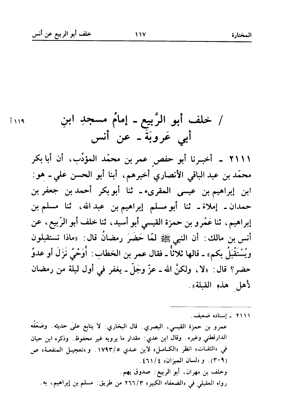 2111 - أَخْبَرَنَا أَبُو حَفْصٍ عُمَرُ بْنُ مُحَمَّدٍ الْمُؤَدِّبُ أَنَّ أَبَا بَكْرٍ مُحَمَّدَ بْنَ عَبْدِ الْبَاقِي الأَنْصَارِيَّ أَخْبَرَهُمْ أبنا أَبُو الْحَسَنِ عَلِيٌّ هُوَ ابْن إِبْرَاهِيم بن عِيسَى المقريء ثَنَا أَبُو بَكْرٍ أَحْمَدُ بْنُ جَعْفَرِ بْنِ حَمْدَانَ إِمْلاءً ثَنَا أَبُو مُسْلِمٍ إِبْرَاهِيمُ بْنُ عَبْدِ اللَّهِ ثَنَا مُسْلِمُ بْنُ إِبْرَاهِيمَ ثَنَا عَمْرُو بْنُ حَمْزَةَ الْقَيْسِيُّ أَبُو أَسِيدٍ ثَنَا خَلَفٌ أَبُو الرَّبِيعِ عَنْ أَنَسِ بْنِ مَالِكٍ أَنَّ النَّبِيَّ صَلَّى اللَّه عَلَيْهِ وَسَلَّمَ لَمَّا حَضَرَ رَمَضَانُ قَالَ مَاذَا تَسْتَقْبِلُونَ وَيُسْتَقْبَلُ بِكُمْ قَالَهَا ثَلاثًا فَقَالَ عُمَرُ بْنُ الْخَطَّابِ أَوَحْيٌ نَزَلَ أَوْ عَدُوٌّ حَضَرَ قَالَ لَا وَلَكِنَّ اللَّهَ عَزَّ وَجَلَّ يَغْفِرُ فِي أَوَّلِ لَيْلَةٍ مِنْ رَمَضَانَ لأَهْلِ هَذِهِ الْقِبْلَةِ