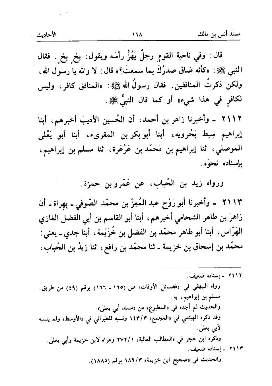 2113 - وَأَخْبَرَنَا أَبُو رَوْحٍ عَبْدُ الْمُعِزِّ بْنُ مُحَمَّدِ الصُّوفِيُّ بِهَرَاةَ أَنَّ زَاهِرَ بْنَ طَاهِرٍ الشَّحَّامِيَّ أَخْبَرَهُمْ أبنا أَبُو الْقَاسِمِ بْنُ أَبِي الْفَضْلِ الْغَازِيُّ الْهراسُ أبنا أَبُو طَاهِرٍ مُحَمَّدُ بْنُ الْفَضْلِ بْنِ خُزَيْمَةَ أبنا جَدِّي يَعْنِي مُحَمَّدُ بْنُ إِسْحَاقَ بْنِ خُزَيْمَةَ ثَنَا مُحَمَّدُ بْنُ رَافِعٍ ثَنَا زَيْدُ بْنُ الْحُبَابِ ثَنَا عَمْرُو بْنُ حَمْزَةَ الْقَيْسِيُّ ثَنَا خَلَفٌ أَبُو الرَّبِيعِ إِمَامُ مَسْجِدِ ابْنِ أَبِي عَرُوبَةَ قَالَ ثَنَا أَنَسِ بْنِ مَالِكٍ قَالَ قَالَ رَسُولُ اللَّهِ