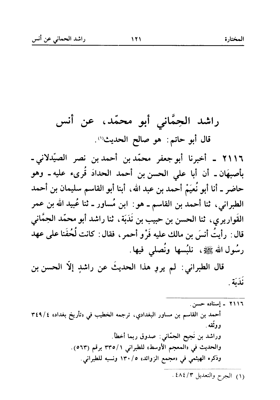 2116 - أَخْبَرَنَا أَبُو جَعْفَرٍ مُحَمَّدُ بْنُ أَحْمَدَ بْنِ نَصْرٍ الصَّيْدَلانِيُّ بِأَصْبَهَانَ أَنَّ أَبَا عَلِيٍّ الْحَسَنَ بْنَ أَحْمَدَ الْحَدَّادَ قُرِئَ عَلَيْهِ وَهُوَ حَاضِرٌ أَنا أَبُو نُعَيْمٍ أَحْمَدُ بْنُ عَبْدِ اللَّهِ أبنا أَبُو الْقَاسِمِ سُلَيْمَانُ بْنُ أَحْمَدَ الطَّبَرَانِيُّ ثَنَا أَحْمَدُ بْنُ الْقَاسِمِ هُوَ ابْنُ مُسَاوِرٍ ثَنَا عُبَيْدُ اللَّهِ بْنُ عُمَرَ الْقَوَارِيرِيُّ ثَنَا الْحَسَنُ بْنُ حَبِيبِ بْنِ نُدْبَةَ ثَنَا رَاشِدٌ أَبُو مُحَمَّدٍ الْحِمَّانِيُّ قَالَ رَأَيْتُ أَنَسَ بْنَ مَالِكٍ عَلَيْهِ فَرْوٌ أَحْمَرُ فَقَالَ كَانَتْ لُحُفُنَا عَلَى عَهْدِ رَسُولِ اللَّهِ صَلَّى اللَّهُ عَلَيْهِ وَسَلَّمَ نَلْبَسُهَا وَنُصَلِّي فِيهَا