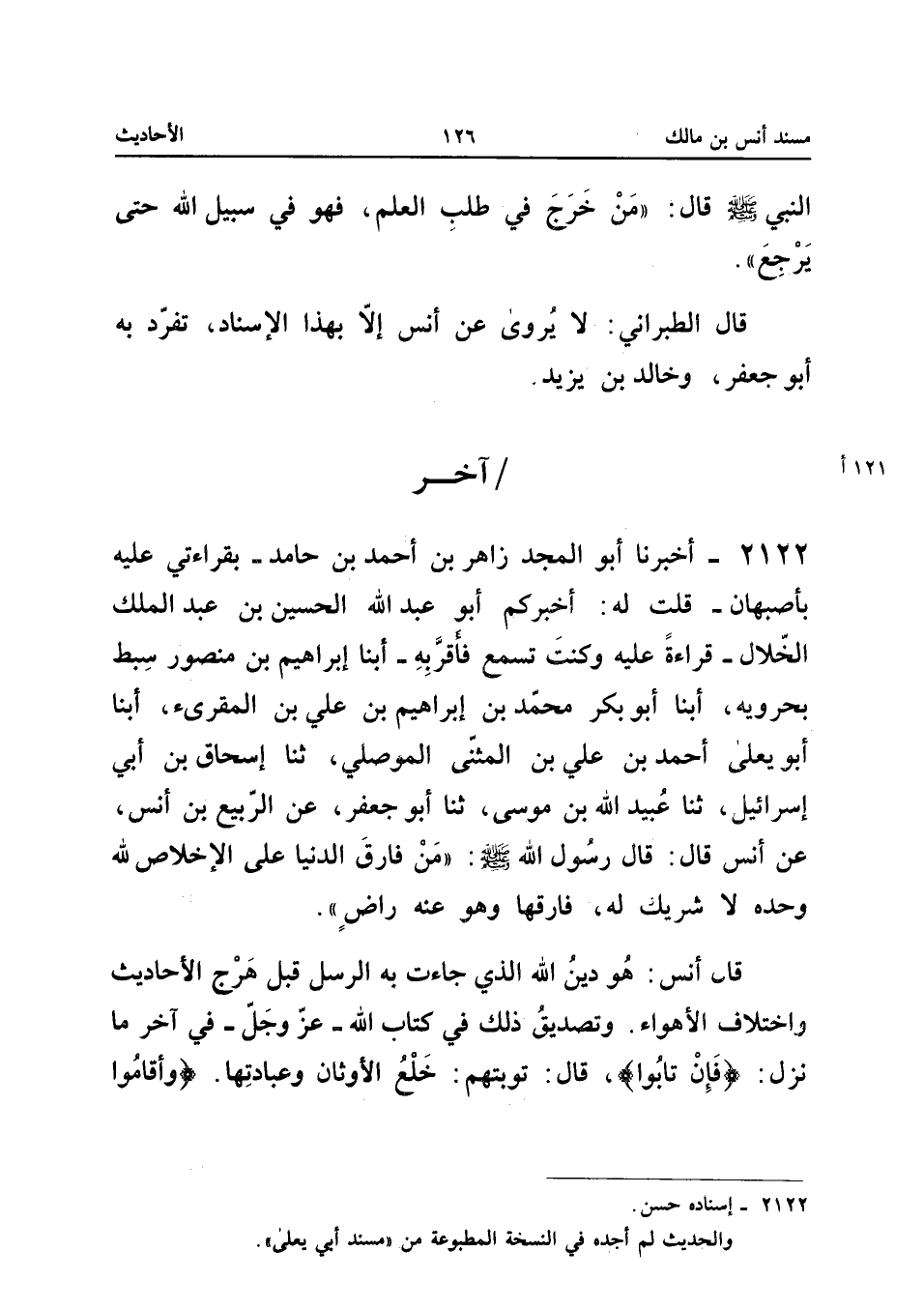 2122 - أَخْبَرَنَا أَبُو الْمَجْدِ زَاهِرُ بْنُ أَحْمَدَ بْنِ حَامِدٍ بِقِرَاءَتِي عَلَيْهِ بِأَصْبَهَانَ قُلْتُ لَهُ أَخْبَرَكُمْ أَبُو عَبْدِ اللَّهِ الْحُسَيْنُ بْنُ عَبْدِ الْمَلِكِ الْخَلالُ قِرَاءَةً عَلَيْهِ وَكُنْتَ تَسْمَعُ فَأَقَرَّ بِهِ أبنا إِبْرَاهِيمُ بْنُ مَنْصُورٍ سِبْطُ بَحْرُوَيْهِ أبنا أَبُو بَكْرٍ مُحَمَّدُ بْنُ إِبْرَاهِيمَ بْنِ عَلِيِّ بن الْمُقْرِئِ أبنا أَبُو يَعْلَى أَحْمَدُ بْنُ عَلِيِّ بْنِ الْمُثَنَّى الْمَوْصِلِيُّ ثَنَا إِسْحَاقُ بْنُ أَبِي إِسْرَائِيلَ ثَنَا عُبَيْدُ اللَّهِ بْنُ مُوسَى ثَنَا أَبُو جَعْفَرٍ عَنِ الرَّبِيعِ بْنِ أَنَسٍ عَنْ أَنَسٍ قَالَ قَالَ رَسُولُ اللَّهِ صَلَّى اللَّهُ عَلَيْهِ وَسَلَّمَ مَنْ فَارَقَ الدُّنْيَا عَلَى الإِخْلاصِ لِلَّهِ وَحْدَهُ لَا شَرِيكَ لَهُ فَارَقَهَا وَهُوَ عَنْهُ رَاضٍ