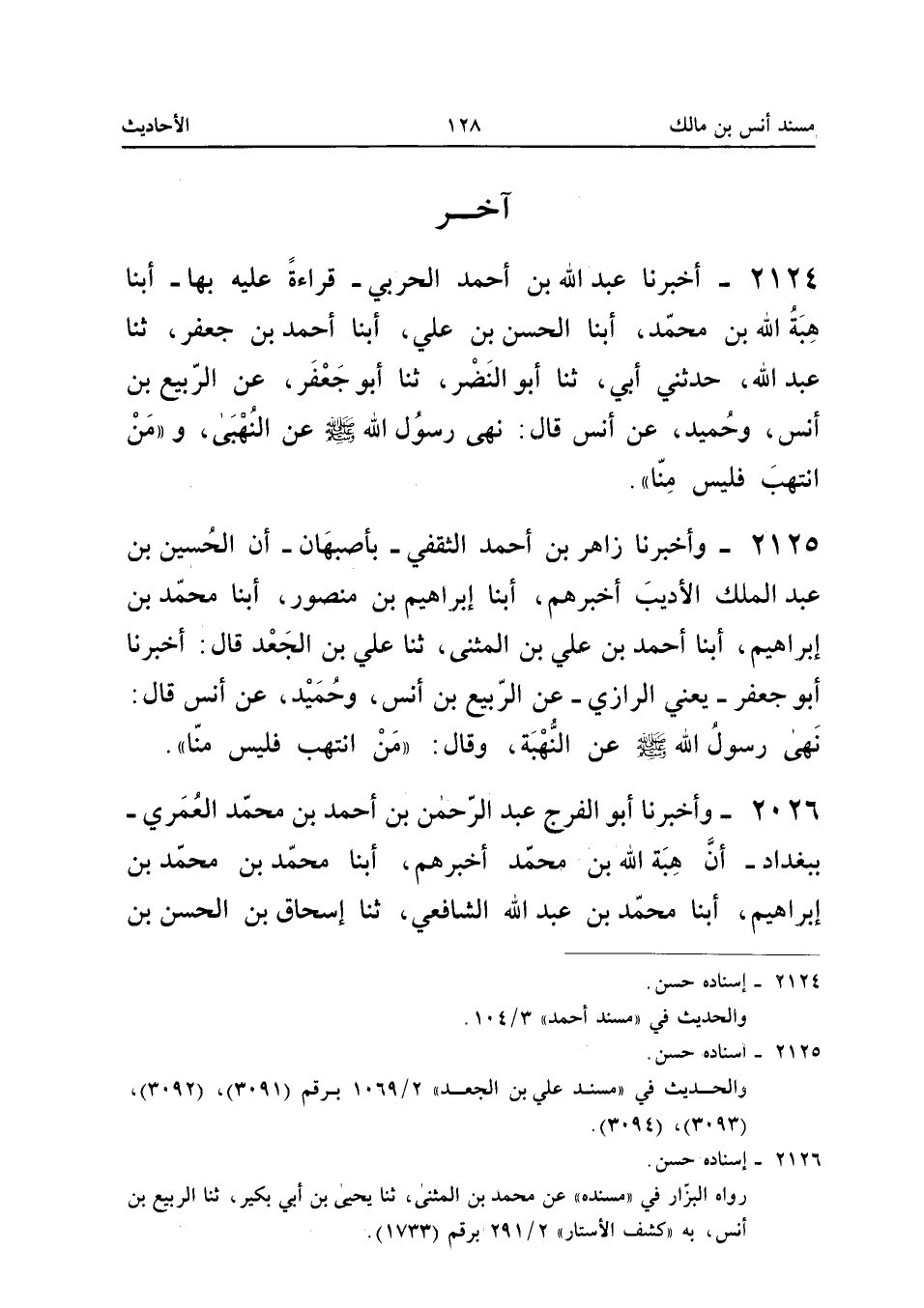 2124 - أَخْبَرَنَا عَبْدُ اللَّهِ بْنُ أَحْمَدَ الْحَرْبِيُّ قِرَاءَةً عَلَيْهِ بِهَا أبنا هِبَةُ اللَّهِ بْنُ مُحَمَّدٍ أبنا الْحَسَنُ بْنُ عَلِيٍّ أبنا أَحْمَدُ بْنُ جَعْفَرٍ ثَنَا عَبْدُ اللَّهِ حَدَّثَنِي أَبِي ثَنَا أَبُو النَّضْرِ ثَنَا أَبُو جَعْفَرٍ عَنِ الرَّبِيعِ بْنِ أَنَسٍ وَحُمَيْدٍ عَنْ أَنَسٍ قَالَ نَهَى رَسُولِ اللَّهِ صَلَّى اللَّهُ عَلَيْهِ وَسَلَّمَ عَنْ النهبى وَمن انتهب فَلَيْسَ منا إِسْنَاده حسن
