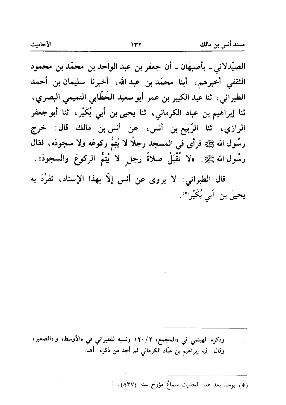 صَلَّى اللَّهُ عَلَيْهِ وَسَلَّمَ فَرَأَى فِي الْمَسْجِدِ رَجُلا لَا يُتِمُّ رُكُوعَهُ وَلا سُجُودَهُ فَقَالَ رَسُولِ اللَّهِ صَلَّى اللَّهُ عَلَيْهِ وَسَلَّمَ لَا تُقْبَلُ صَلاةُ رَجُلٍ لَا يُتِمُّ الرُّكُوعَ وَالسُّجُودَ