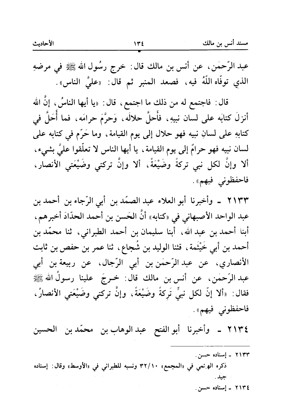 2133 - وَأَخْبَرَنَا أَبُو الْعَلاءِ عَبْدُ الصَّمَدِ بْنُ أَبِي الرَّجَاءِ بْنِ أَحْمَدَ بْنِ عَبْدِ الْوَاحِدِ الأَصْبَهَانِيُّ فِي كِتَابِهِ أَنَّ الْحَسَنَ بْنَ أَحْمَدَ الْحَدَّادَ أَخْبَرَهُمْ أبنا أَحْمَدُ بْنُ عَبْدِ اللَّهِ أبنا سُلَيْمَانُ بْنُ أَحْمَدَ الطَّبَرَانِيُّ ثَنَا مُحَمَّدُ بْنُ أَحْمَدَ بْنِ أَبِي خَيْثَمَةَ قثنا الْوَلِيدُ بْنُ شُجَاعٍ ثَنَا عُمَرُ بْنُ حَفْصِ بْنِ ثَابِتٍ الأَنْصَارِيُّ عَنْ عَبْدِ الرَّحْمَنِ بْنِ أَبِي الرِّجَالِ عَنْ رَبِيعَةَ بْنِ أَبِي عَبْدِ الرَّحْمَنِ عَنْ أَنَسِ بْنِ مَالِكٍ قَالَ خَرَجَ عَلَيْنَا رَسُولُ اللَّهِ صَلَّى اللَّهُ عَلَيْهِ وَسَلَّمَ فَقَالَ أَلا إِنَّ لِكُلِّ نَبِيٍّ تَرِكَةً وَضَيْعَةً وَإِنَّ تَرِكَتِي وضيعتي الْأَنْصَار فاحفظوني فيهم إِسْنَاده حسن
