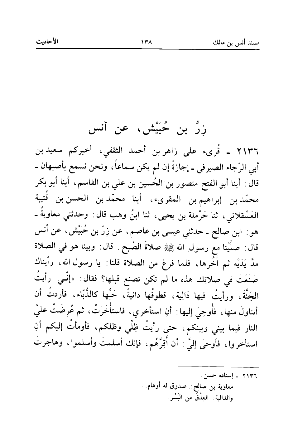2136 - قُرِئَ عَلَى زَاهِرِ بْنِ أَحْمَدَ الثَّقَفِيِّ أَخْبَرَكُمْ سَعِيدُ بْنُ أَبِي الرَّجَاءِ الصَّيْرَفِيُّ إِجَازَةً إِنْ لَمْ يَكُنْ سَمَاعًا وَنَحْنُ نَسْمَعُ بِأَصْبَهَانَ قَالَ أبنا أَبُو الْفَتْحِ مَنْصُورُ بْنُ الْحُسَيْنِ بْنِ عَلِيِّ بْنِ الْقَاسِمِ أبنا أَبُو بَكْرٍ مُحَمَّدُ بن إِبْرَاهِيم بن الْمُقْرِئِ أبنا مُحَمَّدُ بْنُ الْحَسَنِ بْنِ قُتَيْبَةَ الْعَسْقَلانِيُّ ثَنَا حَرْمَلَةُ بْنُ يَحْيَى ثَنَا ابْنُ وَهْبٍ قَالَ وَحَدَّثَنِي مُعَاوِيَةُ هُوَ ابْنُ صَالِحٍ حَدَّثَنِي عِيسَى بْنُ عَاصِمٍ عَنْ زِرِّ بْنِ حُبَيْشٍ عَنْ أَنَسٍ قَالَ صَلَّيْنَا مَعَ رَسُولِ اللَّهِ صَلَّى اللَّهُ عَلَيْهِ وَسَلَّمَ صَلاةَ الصُّبْحِ قَالَ وَبَيْنَا هُوَ فِي الصَّلاةِ مَدَّ يَدَيْهِ ثُمَّ أَخَّرَهَا فَلَمَّا فَرَغَ مِنَ الصَّلاةِ قُلْنَا يَا رَسُولَ اللَّهِ رَأَيْنَاكَ صَنَعْتَ فِي صَلاتِكَ هَذِهِ مَا لَمْ تَكُنْ تَصْنَعُ قَبْلَهَا فَقَالَ إِنِّي رَأَيْتُ الْجَنَّةَ وَرَأَيْتُ فِيهَا دَالِيَةً قُطُوفُهَا دَانِيةٌ حَبُّهَا كَالدُّبَّاءِ فَأَرَدْتُ أَنْ أَتَنَاوَلَ مِنْهَا فَأُوحِيَ إِلَيْهَا أَنِ اسْتَأْخِرِي فَاسْتَأْخَرَتْ ثُمَّ عُرِضَتْ عَليّ النَّار فِيمَا بني وَبَيْنَكُمْ حَتَّى رَأَيْتُ ظِلِّي وَظِلَّكُمْ فَأَوْمَأْتُ إِلَيْكُمْ أَنِ اسْتَأْخِرُوا فَأُوحِيَ إِلَيَّ أَنْ أَقِرَّهُمْ فَإِنَّكَ أَسْلَمْتَ وَأَسْلَمُوا وَهَاجَرْتَ
