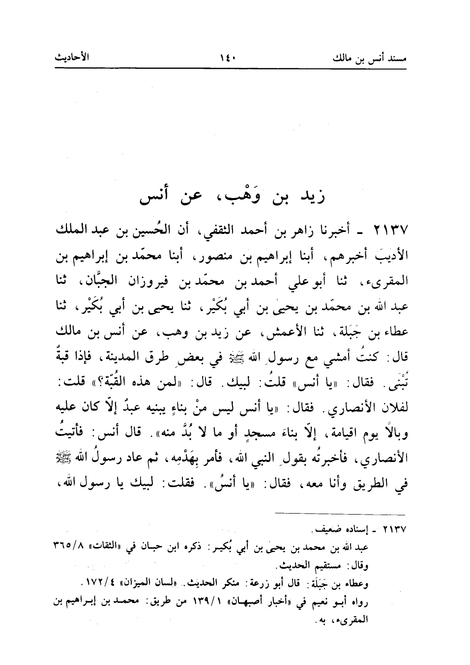 2137 - أَخْبَرَنَا زَاهِرُ بْنُ أَحْمَدَ الثَّقَفِيُّ أَنَّ الْحُسَيْنَ بْنَ عَبْدِ الْمَلِكِ الأدِيبَ أَخْبَرَهُمْ أبنا إِبْرَاهِيمُ بْنُ مَنْصُورٍ أبنا مُحَمَّدُ بْنُ إِبْرَاهِيمَ بْنِ الْمُقْرِئِ ثَنَا أَبُو عَلِيٍّ أَحْمَدُ بْنُ مُحَمَّدِ بْنِ فَيْرُوزَانَ الْجَبَّانُ ثَنَا عَبْدُ اللَّهِ بْنُ مُحَمَّدِ بْنِ يَحْيَى بْنِ أَبِي بُكَيْرٍ ثَنَا يَحْيَى بْنُ أَبِي بُكَيْرٍ ثَنَا عَطَاءُ بْنُ جَبَلَةَ ثَنَا الأَعْمَشُ عَنْ زَيْدِ بْنِ وَهْبٍ عَنْ أَنَسِ بْنِ مَالِكِ قَالَ كُنْتُ أَمْشِي مَعَ رَسُولِ اللَّهِ صَلَّى اللَّهُ عَلَيْهِ وَسَلَّمَ فِي بَعْضِ طُرُقِ الْمَدِينَةِ فَإِذَا قُبَّةٌ تُبْنَى فَقَالَ يَا أَنَسُ قُلْتُ لَبَّيْكَ قَالَ لِمَنْ هَذِهِ الْقُبَّةُ قُلْتُ لِفُلانٍ الأَنْصَارِيِّ فَقَالَ يَا أَنَسُ لَيْسَ مِنْ بِنَاءٍ يَبْنِيهِ عَبْدٌ إِلا كَانَ عَلَيْهِ وَبَالا يَوْمَ الْقِيَامَةِ إِلا بِنَاءَ مَسْجِدٍ أَوْ مَا لَا بُدَّ مِنْهُ قَالَ أَنَسٌ فَأَتَيْتُ الأَنْصَارِيَّ فَأَخْبَرْتُهُ بِقَوْلِ النَّبِيِّ فَأَمَرَ بِهَدْمِهِ ثُمَّ عَادَ رَسُولُ اللَّهِ صَلَّى اللَّهُ عَلَيْهِ وَسَلَّمَ فِي الطَّرِيقِ وَأَنَا مَعَهُ فَقَالَ يَا أَنَسُ فَقُلْتُ لَبَّيْكَ يَا رَسُولَ اللَّهِ