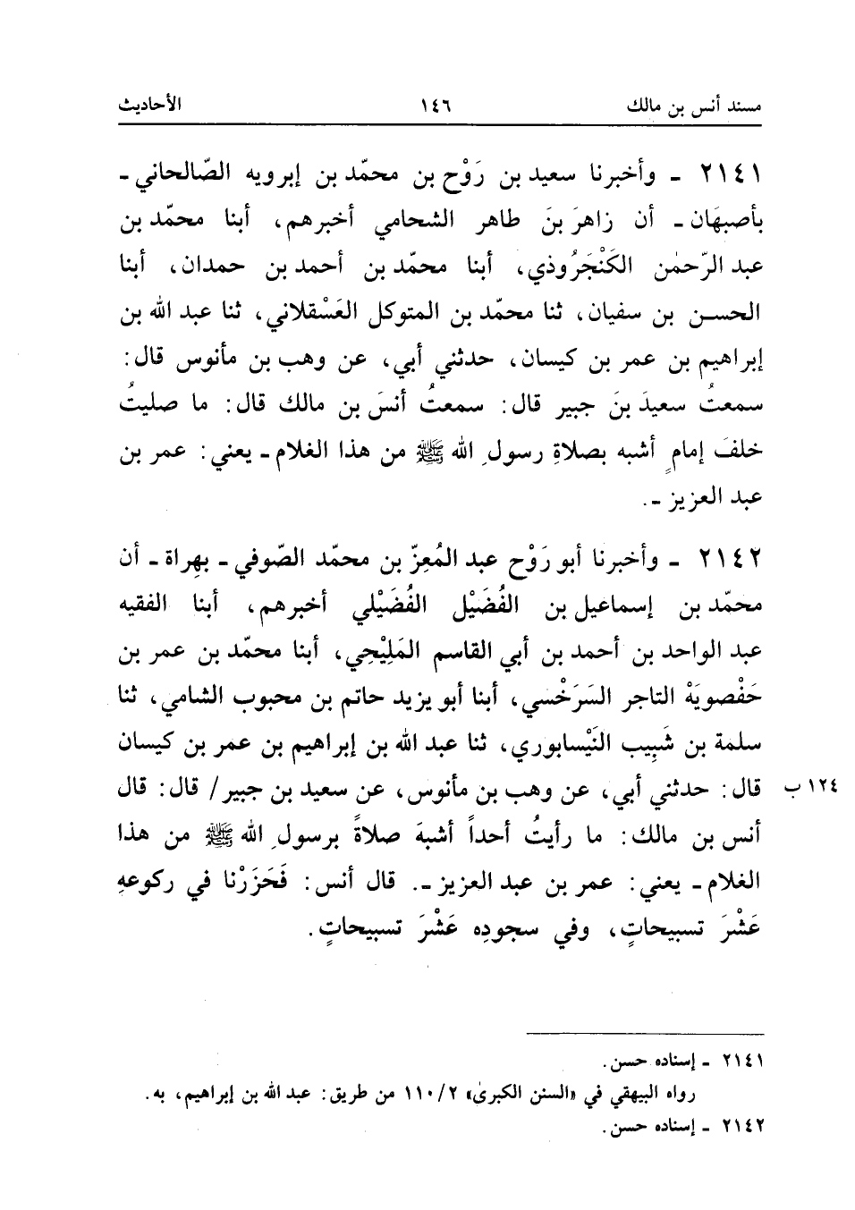 2142 - وَأَخْبَرَنَا أَبُو رَوْحٍ عَبْدُ الْمُعِزِّ بْنُ مُحَمَّدِ الصُّوفِيُّ بِهَرَاةَ أَنَّ مُحَمَّدَ بْنَ إِسْمَاعِيلَ بْنِ الْفُضَيْلِ الْفُضَيْلِيَّ أَخْبَرَهُمْ أبنا الْفَقِيهُ عَبْدُ الْوَاحِدِ بْنُ أَحْمَدَ بْنِ أَبِي الْقَاسِمِ الْمَلِيحِيُّ أبنا مُحَمَّدُ بْنُ عُمَرَ بْنِ حَفْصُوَيْهِ التَّاجِرُ السَّرَخْسِيُّ أبنا أَبُو يَزِيدُ حَاتِمُ بْنُ مَحْبُوبٍ الشَّامِيُّ ثَنَا سَلَمَةُ بْنُ شَبِيبٍ النَّيْسَابُورِيُّ ثَنَا عَبْدُ اللَّهِ بْنُ إِبْرَاهِيمَ بْنِ عُمَرَ بْنِ كَيْسَانَ قَالَ حَدَّثَنِي أَبِي عَنْ وَهْبِ بْنِ مَانُوسَ عَنْ سَعِيدِ بْنِ جُبَيْرٍ قَالَ قَالَ أَنَسُ بْنُ مَالِكٍ مَا رَأَيْتُ أَحَدًا أَشْبَهَ صَلاةً بِرَسُولِ اللَّهِ صَلَّى اللَّهُ عَلَيْهِ وَسَلَّمَ مِنْ هَذَا الْغُلامِ يَعْنِي عُمَرَ بْنَ عَبْدِ الْعَزِيزِ قَالَ أَنَسٌ فَحَزَرْنَا فِي رِكُوعِهِ عَشْرَ تَسْبِيحَاتٍ وَفِي سُجُودِهِ عَشْرَ تَسْبِيحَاتٍ