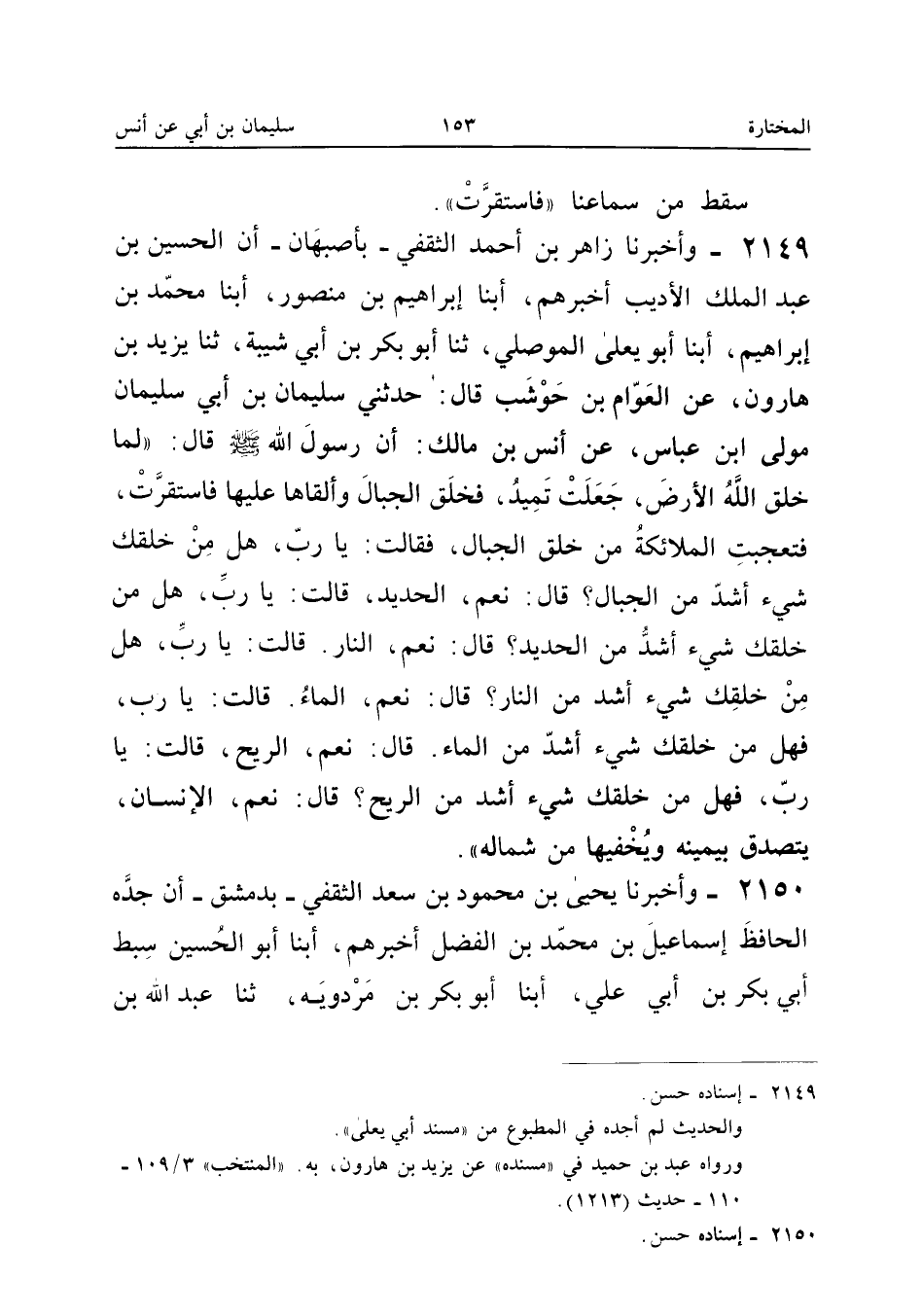 2149 - وأَخْبَرَنَا زَاهِرُ بْنُ أَحْمَدَ الثَّقَفِيُّ بِأَصْبَهَانَ أَنَّ الْحُسَيْنَ بْنَ عَبْدِ الْمَلِكِ الأدِيبَ أَخْبَرَهُمْ أبنا إِبْرَاهِيمُ بْنُ مَنْصُورٍ أبنا مُحَمَّدُ بْنُ إِبْرَاهِيمَ أبنا أَبُو يَعْلَى الْمَوْصِلِيُّ ثَنَا أَبُو بَكْرِ بْنُ أَبِي شَيْبَةَ ثَنَا يَزِيدُ بْنُ هَارُونَ عَنِ الْعَوَّامِ بْنِ حَوْشَبٍ قَالَ حَدَّثَنِي سُلَيْمَانُ بْنُ أَبِي سُلَيْمَانَ مَوْلَى ابْنِ عَبَّاسٍ عَنْ أَنَسُ بْنُ مَالِكٍ أَنَّ رَسُولَ اللَّهِ صَلَّى اللَّهُ عَلَيْهِ وَسَلَّمَ قَالَ لَمَّا خَلَقَ اللَّهُ الأَرْضَ جَعَلَتْ تَمِيدُ فَخَلَقَ الْجِبَالَ وَأَلْقَاهَا عَلَيْهَا فَاسْتَقَرَّتْ فَتَعَجَّبَتِ الْمَلائِكَةُ مِنْ خَلْقِ الْجِبَالِ فَقَالَتْ يَا رَبِّ هَلْ مِنْ خَلْقِكَ شَيْءٌ أَشَدُّ مِنَ الْجِبَالِ قَالَ نَعَمْ الْحَدِيدُ قَالَتْ يَا رَبِّ هَلْ مِنْ خَلْقِكَ شَيْءٌ أَشَدُّ مِنَ الْحَدِيدِ قَالَ نَعَمْ النَّارُ قَالَتْ يَا رَبِّ هَلْ مِنْ خَلْقِكَ شَيْءٌ أَشَدُّ مِنَ النَّارِ قَالَ نَعَمْ الْمَاءُ قَالَتْ يَا رَبِّ فَهَلْ مِنْ خَلْقِكَ شَيْءٌ أَشَدُّ مِنَ الْمَاءِ قَالَ نَعَمْ الرِّيحُ قَالَتْ يَا رَبِّ فَهَلْ مِنْ خَلْقِكَ شَيْءٌ أَشَدُّ مِنَ الرِّيحِ قَالَ نَعَمْ الْإِنْسَان يتَصَدَّق بِيَمِينِهِ ويخفيها من شِمَاله إِسْنَاده حسن