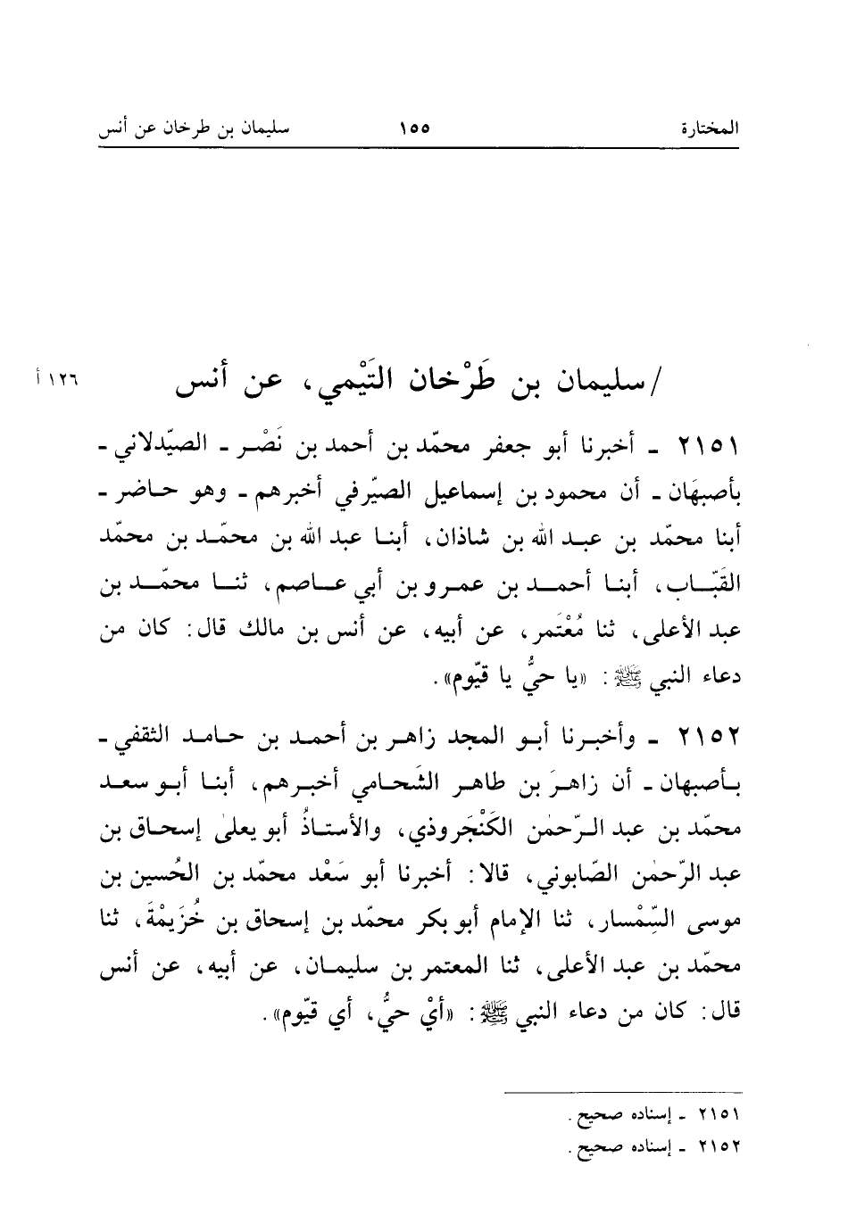 2151 - أَخْبَرَنَا أَبُو جَعْفَرٍ مُحَمَّدُ بْنُ أَحْمَدَ بْنِ نَصْرٍ الصَّيْدَلانِيُّ بِأَصْبَهَانَ أَنَّ مَحْمُودَ بْنَ إِسْمَاعِيلَ الصَّيْرَفِيَّ أَخْبَرَهُمْ وَهُوَ حَاضِرٌ أبنا مُحَمَّدُ بْنُ عَبْدِ اللَّهِ بْنِ شَاذَانَ أبنا عَبْدُ اللَّهِ بْنُ مُحَمَّدِ بْنِ مُحَمَّدٍ الْقَبَّابُ أبنا أَحْمَدُ بْنُ عَمْرِو بْنِ أَبِي عَاصِمٍ ثَنَا مُحَمَّدُ بْنُ عَبْدِ الأَعْلَى ثَنَا مُعْتَمِرٌ عَنْ أَبِيهِ عَنْ أَنَسِ بْنِ مَالِكٍ قَالَ كَانَ مِنْ دُعَاءِ النَّبِيِّ صَلَّى اللَّهُ عَلَيْهِ وَسَلَّمَ يَا حَيّ يَا قيوم إِسْنَاده صَحِيح