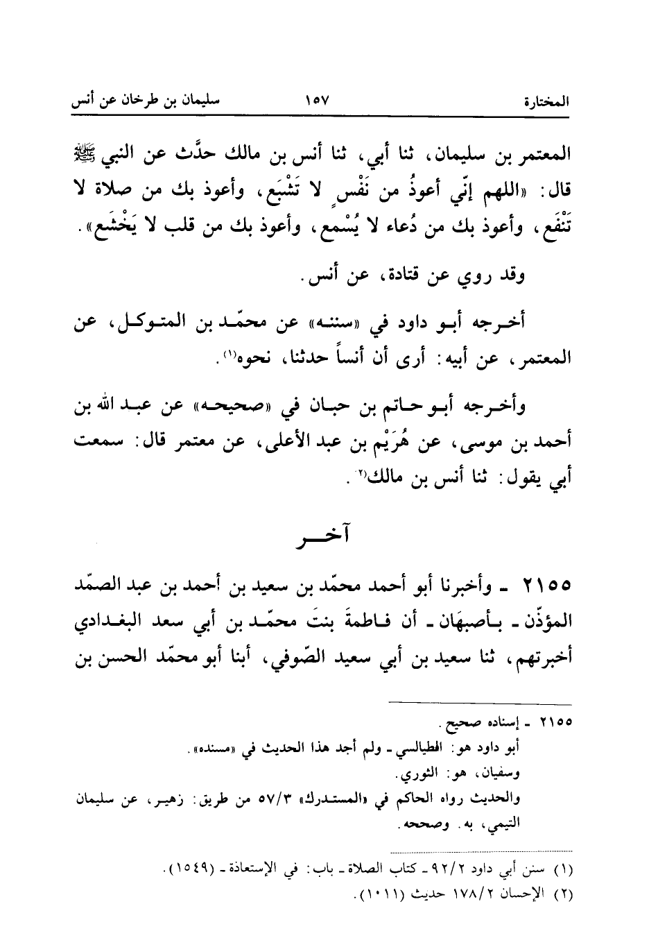 2155 - وَأَخْبَرَنَا أَبُو أَحْمَدَ مُحَمَّدُ بْنُ سَعِيدِ بْنِ أَحْمَدَ بْنِ عَبْدِ الصَّمَدِ الْمُؤَذِّنُ بِأَصْبَهَانَ أَنَّ فَاطِمَةَ بِنْتَ مُحَمَّدِ بْنِ أَبِي سَعْدٍ الْبَغْدَادِيَّ أَخْبَرَتْهُمْ ثَنَا سَعِيدُ بْنُ أَبِي سَعِيدٍ الصُّوفِيُّ أبنا أَبُو مُحَمَّدٍ الْحَسَنُ بْنُ أَحْمَدَ بْنِ مُحَمَّدِ بْنِ الْحَسَنِ بْنِ عَلِيِّ بْنِ مَخْلَدِ بْنِ شَيْبَانَ الْمَخْلَدِيُّ الْمُعَدَّلُ ثَنَا مَكِّيُّ بْنُ عَبْدَانَ ثَنَا عَمَّارُ بْنُ رَجَاءٍ ثَنَا أَبُو دَاوُدَ عَنْ سُفْيَانَ عَنْ سُلَيْمَانَ التَّيْمِيِّ عَنْ أَنَسٍ قَالَ كَانَ رَسُولُ اللَّهِ