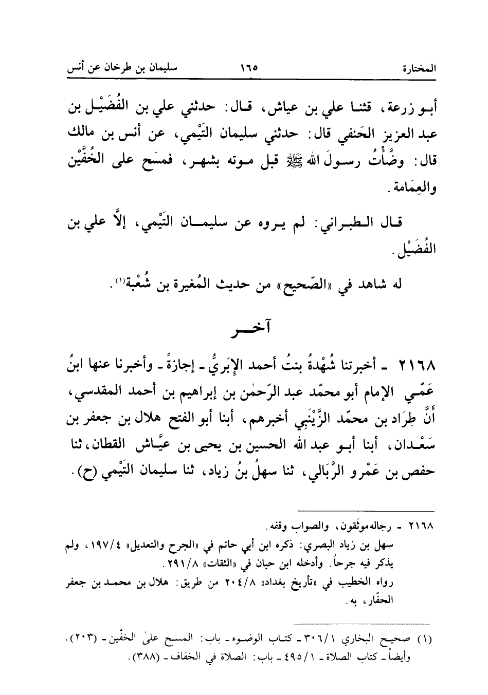 قَالَ الطَّبَرَانِيُّ لَمْ يَرْوِهِ عَنْ سُلَيْمَانَ التَّيْمِيِّ إِلا عَلِيُّ بْنُ الْفُضَيْلِ لَهُ شَاهِدٌ فِي الصَّحِيحِ مِنْ حَدِيثِ الْمُغيرَة بن شُعْبَة