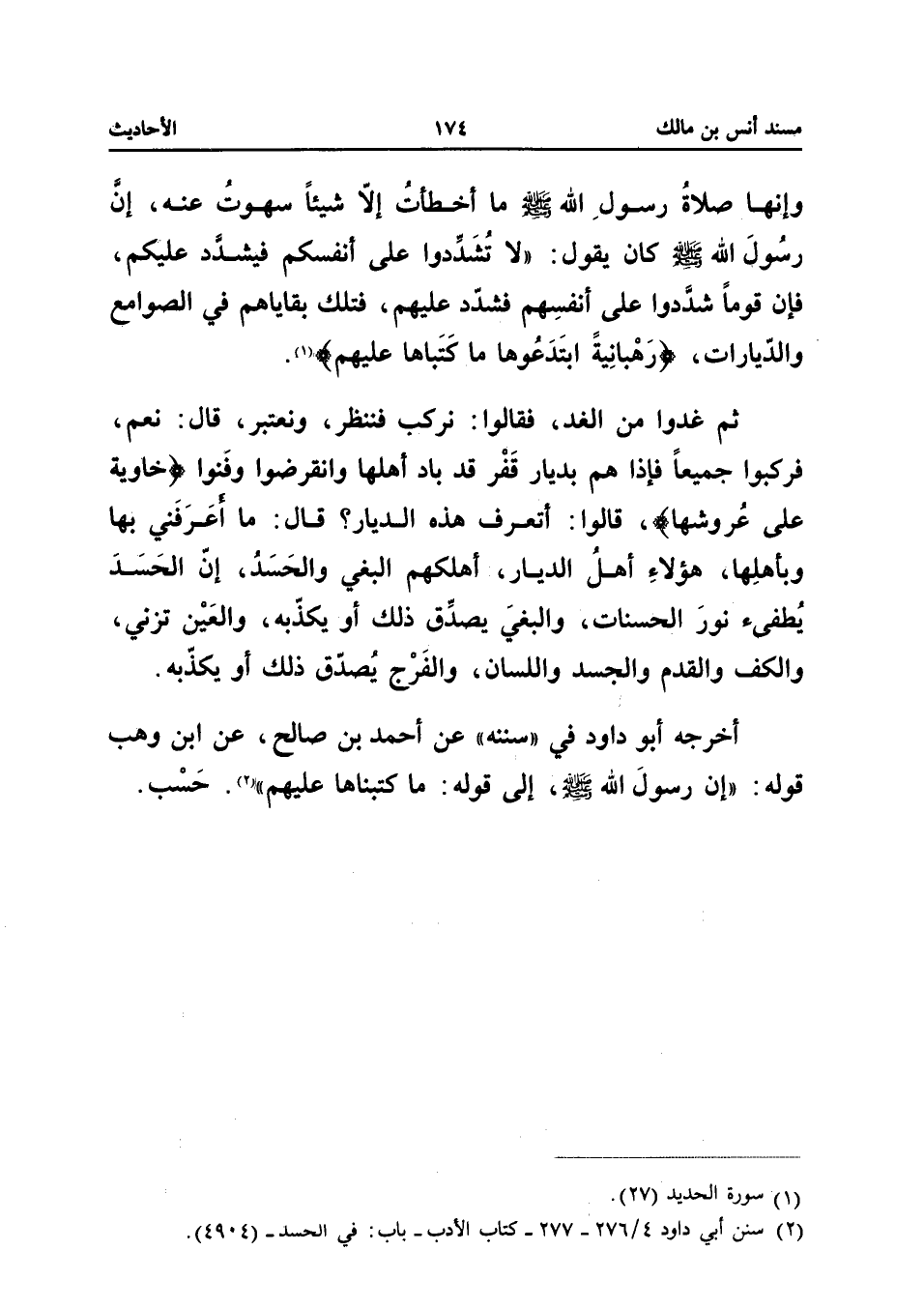 صَلَّى اللَّهُ عَلَيْهِ وَسَلَّمَ مَا أَخْطَأْتُ إِلا شَيْئًا سَهَوْتُ عَنْهُ إِنَّ رَسُولَ اللَّهِ صَلَّى اللَّهُ عَلَيْهِ وَسَلَّمَ كَانَ يَقُولُ لَا تُشَدِّدُوا عَلَى أَنْفُسِكُمْ فُيُشَدَّدَ عَلَيْكُمْ فَإِنَّ قَوْمًا شَدَّدُوا عَلَى أَنْفُسِهِمْ فَشُدِّدَ عَلَيْهِمْ فَتِلْكَ بَقَايَاهُمْ فِي الصَّوَامِعِ وَالدِّيَارَاتِ {وَرَهْبَانِيَّةً ابْتَدَعُوهَا مَا كَتَبْنَاهَا عَلَيْهِمْ} ثُمَّ غَدَوْا مِنَ الْغَدِ فَقَالُوا نَرْكَبُ فَنَنْظُرُ وَنَعْتَبِرُ قَالَ نَعَمْ فَرَكِبُوا جَمِيعًا فَإِذَا هُمْ بِدِيَارٍ قَفْرٍ قَدْ بَادَ أَهْلُهَا وَانْقَرَضُوا وَفَنُوا {خاوية على عروشها} قَالُوا أَتَعْرِفُ هَذِهِ الدِّيَارَ قَالَ مَا أَعْرَفَنِي بِهَا وَبِأَهْلِهَا هَؤُلاءِ أَهْلُ الدِّيَارِ أَهْلَكَهُمُ الْبَغْيُ والحسد إِن الْحَسَد يطفىء نُورَ الْحَسَنَاتِ وَالْبَغْيُ يُصَدِّقُ ذَلِكَ أَوْ يُكَذِّبُهُ وَالْعَيْنُ تَزْنِي وَالْكَفُّ وَالْقَدَمُ وَالْجَسَدُ وَاللِّسَانُ وَالْفَرْجُ يُصَدِّقُ ذَلِكَ أَوْ يُكَذِّبُهُ أَخْرَجَهُ أَبُو دَاوُدَ فِي سُنَنِهِ عَنْ أَحْمَدَ بْنِ صَالِحٍ عَنِ ابْنِ وَهْبٍ قَوْلَهُ إِنَّ رَسُولَ اللَّهِ صَلَّى اللَّهُ عَلَيْهِ وَسَلَّمَ إِلَى قَوْلِهِ مَا كَتَبْنَاهَا عَلَيْهِم حسب