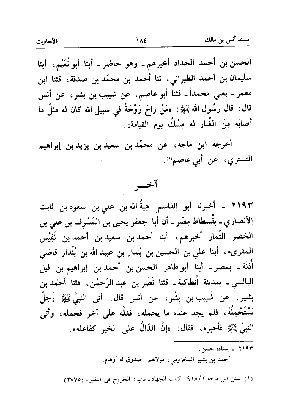 2193 - أَخْبَرَنَا أَبُو الْقَاسِمِ هِبَةُ اللَّهِ بْنُ عَلِيِّ بْنِ سُعُودِ بْنِ ثَابِتٍ الأَنْصَارِيُّ بِفُسْطَاطِ مِصْرَ أَنَّ أَبَا جَعْفَرٍ يَحْيَى بْنَ الْمُسْرِفِ بْنِ عَلِيِّ بْنِ الْخَضِرِ التَّمَّارَ أَخْبَرَهُمْ أبنا أَحْمَدُ بْنُ سَعِيدِ بْنِ أَحْمَدَ بْنِ نَفِيسٍ الْمُقْرِئُ أبنا عَلِيُّ بْنُ الْحُسَيْنِ بْنِ بُنْدَارِ بْنِ عُبَيْدِ اللَّهِ بْنِ بُنْدَارٍ قَاضِي أَذَنَةَ بِمِصْرَ أبنا أَبُو طَاهِرٍ الْحَسَنُ بْنُ أَحْمَدَ بْنِ إِبْرَاهِيمَ بْنِ فِيلٍ الْبَالِسِيُّ بِمَدِينَةِ أَنْطَاكِيَّةَ قثنا نَصْرُ بْنُ عَبْدِ الرَّحْمَنِ قثنا أَحْمَدُ بْنُ بَشِيرٍ عَنْ شَبِيبِ بْنِ بِشْرٍ عَنْ أَنَسٍ قَالَ أُتِيَ النَّبِيُّ صَلَّى اللَّهُ عَلَيْهِ وَسَلَّمَ رَجُلٌ يَسْتَحْمِلُهُ فَلَمْ يَجِدْ عِنْدَهُ مَا يَحْمِلُهُ فَدَلَّهُ عَلَى آخَرَ فَحَمَلَهُ وَأَتَى النَّبِيَّ صَلَّى اللَّهُ عَلَيْهِ وَسَلَّمَ فَأَخْبَرَهُ فَقَالَ إِنَّ الدَّالَّ عَلَى الْخَيْرِ كَفَاعِلِهِ