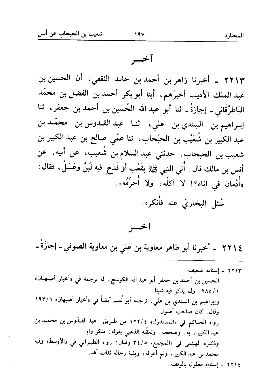 2213 - أَخْبَرَنَا زَاهِرُ بْنُ أَحْمَدَ بْنِ حَامِدٍ الثَّقَفِيُّ أَنَّ الْحُسَيْنَ بْنَ عَبْدِ الْمَلِكِ الأَدِيبَ أَخْبَرَهُمْ أبنا أَبُو بَكْرٍ أَحْمَدُ بْنُ الْفَضْلِ بْنِ مُحَمَّدٍ الْبَاطِرْقَانِيُّ إِجَازَةً ثَنَا أَبُو عَبْدِ اللَّهِ الْحُسَيْنُ بْنُ أَحْمَدَ بْنِ جَعْفَرٍ ثَنَا إِبْرَاهِيمُ بن السِّنْدِيِّ بْنِ عَلِيٍّ ثَنَا عَبْدُ الْقُدُّوسِ بْنُ مُحَمَّدِ بْنِ عَبْدِ الْكَبِيرِ بْنِ شُعَيْبِ بْنِ الْحَبْحَابِ ثَنَا عَمِّي صَالِحُ بْنُ عَبْدِ الْكَبِيرِ بْنِ شُعَيْبِ بْنِ الْحَبْحَابِ حَدَّثَنِي عَبْدُ السَّلامِ بْنُ شُعَيْبٍ عَنْ أَبِيهِ عَنْ أَنَسِ بْنِ مَالِكٍ قَالَ أُتِيَ النَّبِيُّ صَلَّى اللَّهُ عَلَيْهِ وَسَلَّمَ بِقَعْبٍ أَوْ قَدَحٍ فِيهِ لَبَنٌ وَعَسَلٌ فَقَالَ أُدْمَانِ فِي إِنَاءٍ لَا آكُلُهُ وَلا أحرمهُ
